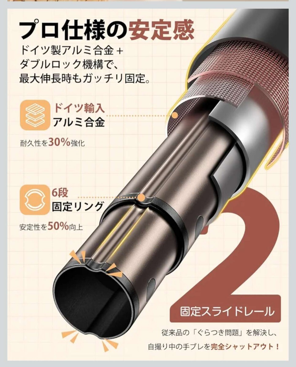 【ドイツ製アルミ合金×ダブルロックで超安定】 「伸ばしても絶対ブレない」を実現する航空宇宙級アルミ合金採用。スマホ カメラ用三脚は特殊ダブルレールロック機構で、最大伸長時もガチっと固定。従来品の「ぐらつき問題」を完全解決し、走りながらの自撮りや群衆の中での撮影も安心のプロ級安定性。