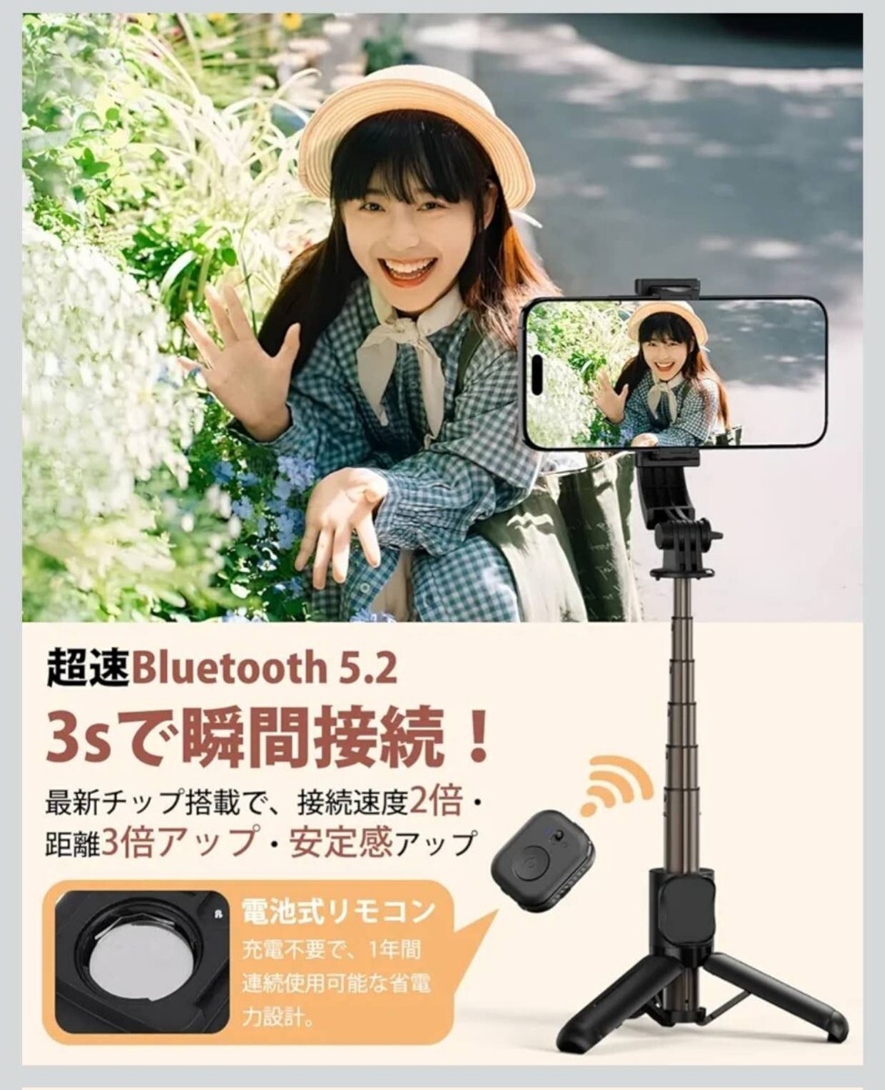【Bluetooth5.2で超高速接続】 Bluetooth5.2チップ搭載で、接続速度は従来比200%UP。最大10mの長距離通信が可能に!混雑した観光地でも途切れない安定接続で、「グループ写真は離れて撮ると全員入る」が簡単実現。カメラ用三脚のリモコンは機械式スイッチ&交換可能電池式なので、充電切れの心配なし。