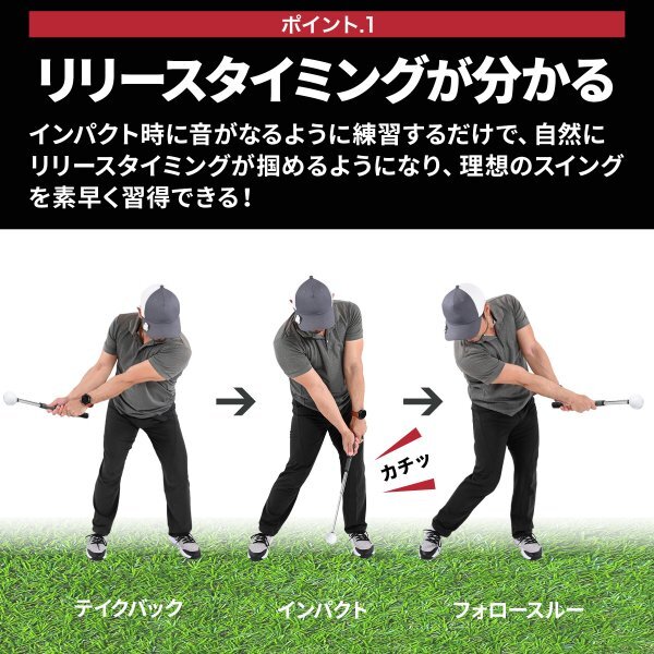 【正しいリリースのタイミングを掴む矯正トレーナー】このすぶり棒はリリースのタイミングが音でわかるスイングトレーナーなので、正しく振れていれば遠心力によってシャフトが伸び、伸びきったタイミングで『カチッ』と音が鳴ります。正しいタイミングはボール上のインパクト時、もしくはちょうどその後のフォロースロー時ですので、どこで鳴るのか確認し、修正していくことができます。
