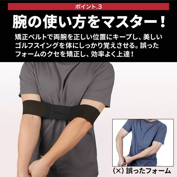 【自然と脇が締まったプロのようなスイングを掴む矯正バンド】このバンドにより正しいスイングの動きを体に覚えさせ、シャフトクロス、オーバースイング、バックスイングやフォロースイングでのひじの引けを改善。腕と体が同調したスイングが身につき、アイアンの捕まったショット、ミート率向上、飛距離アップなどが狙えます。