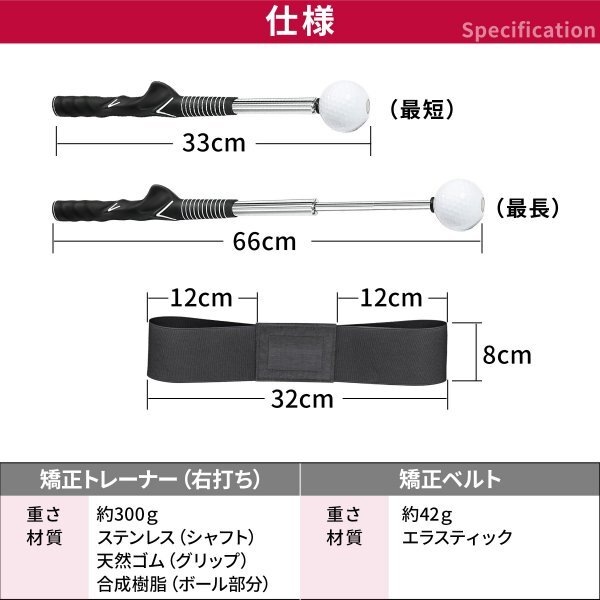 【製品情報】セット内容:矯正トレーナー+矯正バンド サイズ:スイング前33cm・スイング中66cm ベルト/32cm・腕部分12cm・幅8cm 重さ:300g/42g ※モニターの環境等により、色の見え方に若干の違いがある場合がございます。