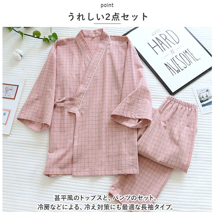| 商品説明 | ・・リラックスタイムをもっと快適に。夏にぴったりの、甚平風セットアップが新登場。 ・【うれしい2点セット】 ・甚平風のトップスと、パンツのセット。冷房などによる、冷え対策にも最適な長袖タイプ。 ・【柔らかく優しい肌触り】 ・サラッと軽いコットン素材を使用。お肌に優しく、汗ばむ季節もムレにくい! ・【ストレスフリーな着用感】 ・程よくゆったりとしたシルエットで、締めつけ感なし☆入院着などにもおすすめ。 ・【ペア使いできるカラー&サイズ】 ・落ち着きのあるカラーをラインナップ。ユニセックス仕様のサイズ展開なので、お揃いで着用可能。 ・《トップス》 ・【サッと羽織れるつくり】 ・バタバタしがちなお風呂上がりにも、スムーズに着用できる和式の前開きタイプ!内紐&外紐付きで、はだけにくいのもポイント。 ・【便利なポケット付き】 ・片サイドに配置されたポケットには、スマホなどをIN。 ・《パンツ》 ・【快適なロングパンツ】 ・窮屈感がなく、サッと着脱できるウエストゴム仕様。単体使いもOK。 |