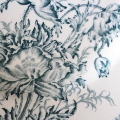 深みのあるブルーの単色転写で、花びらや葉の繊細な陰影までが表現されており、アール・ヌーヴォーの影響も感じさせるような、たおやかな美しさが際立っています。