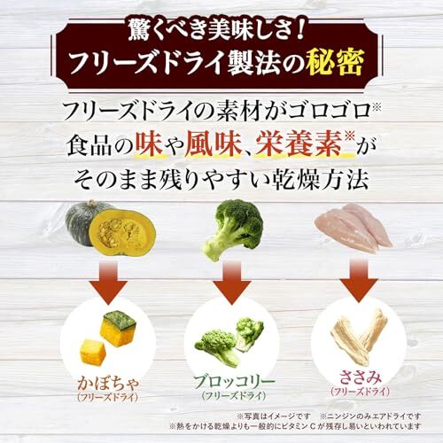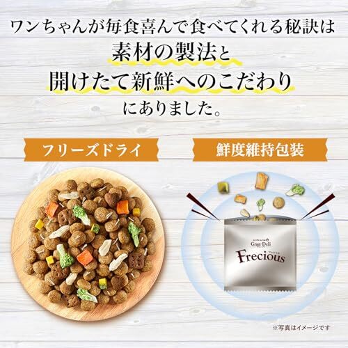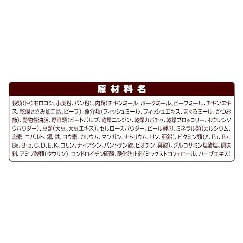 商品紹介 できたて鮮度の香りと素材の美味しさが実感できる国産プレミアムドッグフードです。 原材料・成分 【原材料】 穀類(トウモロコシ、小麦粉、パン粉)、肉類(チキンミール、チキンエキス、乾燥ささみ加工品、ビーフミール、ポークミール、ビーフ)、魚介類(フィッシュミール、フィッシュエキス、まぐろミール、かつお節)、動物性油脂、野菜類(ビートパルプ、乾燥にんじん、乾燥ブロッコリー、乾燥かぼちゃ、ほうれんそうパウダー)、豆類(大豆、大豆エキス)、セルロースパウダー、ビール酵母、ミネラル類(カルシウム、塩素、コバルト、銅、鉄、ヨウ素、カリウム、マンガン、ナトリウム、リン、亜鉛)、ビタミン類(A、B1、B2、B6、B12、C、D、E、K、コリン、ナイアシン、パントテン酸、ビオチン、葉酸)、グルコサミン塩酸塩、調味料、アミノ酸類(タウリン)、コンドロイチン硫酸、酸化防止剤(ミックストコフェロール、ハーブエキス) 【成分】 たんぱく質20.0%以上、脂質11.0%以上、粗繊維4.5%以下、灰分8.5%以下、水分10.0%以下 【エネルギー】 365kcal/100g 使用方法 【1日の食事量の目安】 成犬時の体重1kg:30g 成犬時の体重2kg:50g 成犬時の体重3kg:70g 成犬時の体重4kg:85g 成犬時の体重5kg:100g 成犬時の体重6kg:115g 成犬時の体重7kg:130g 成犬時の体重8kg:145g 成犬時の体重9kg:155g 成犬時の体重10kg:170g 成犬時の体重15kg:230g 成犬時の体重20kg:285g ・1日食事量を数回に分けて与えてください。 ・上記を目安に愛犬が最適な体重を維持できるよう、適宣調整してください。 ・必要な栄養素がバランスよく取れますので、本製品と水のみで毎日の食事として与えることができます。 ・愛犬の体重や状態、運動量に合わせて量を調整して与えてください。 ・食事は清潔なお皿で与え、新鮮な水をいつでも飲めるように用意してください。 ・初めて与える場合は、一度に多量を食べさせると便がゆるくなることがあるため、今までの食事に少量混ぜ、徐々に量を増やしながら、1~2週間で切り替えてください。