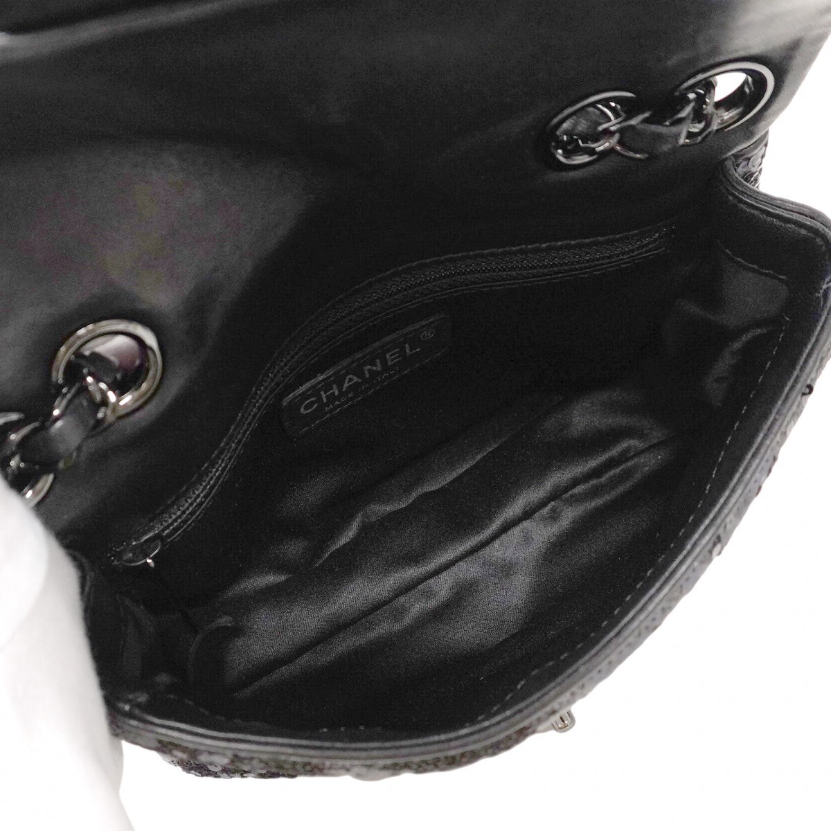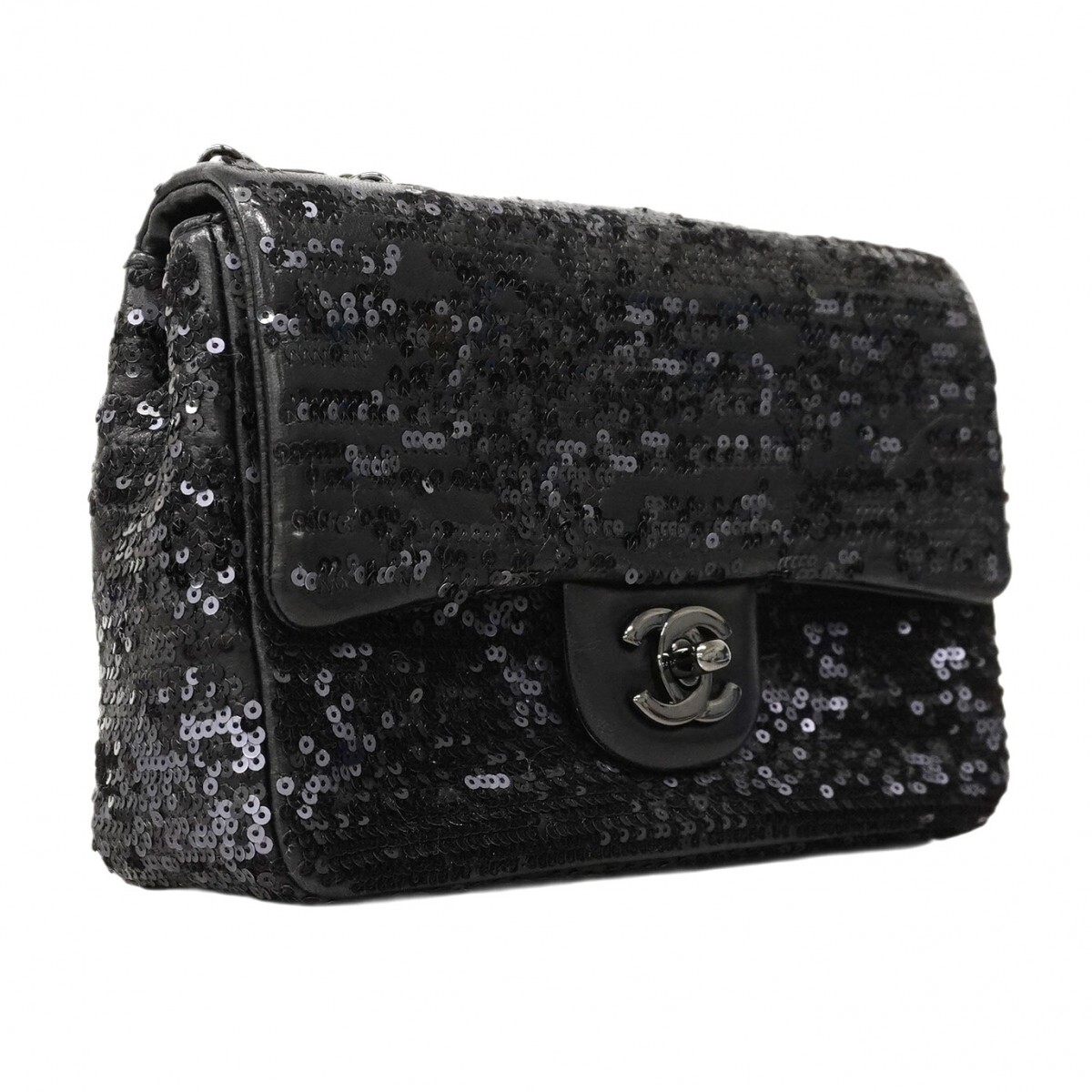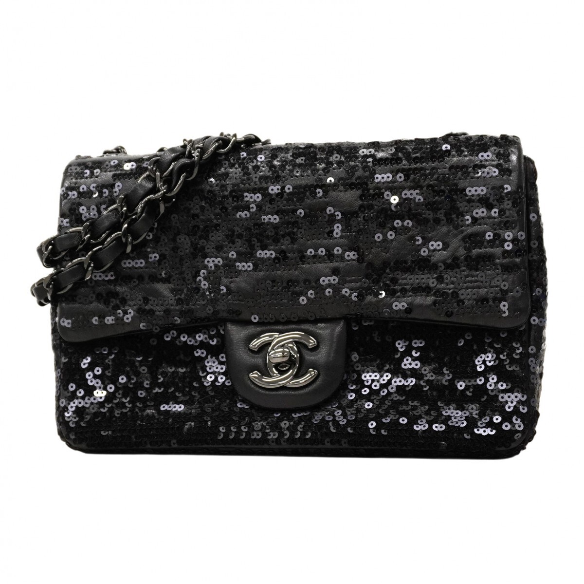 【5mc2510-h】シャネル ショルダーバッグ ミニマトラッセ Wチェーン ラムスキン スパンコール ブラック【中古】レディース