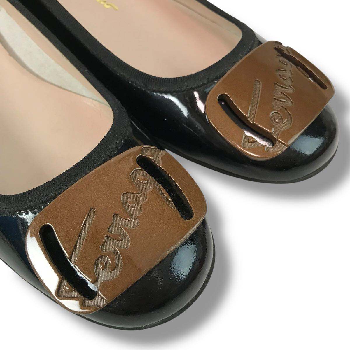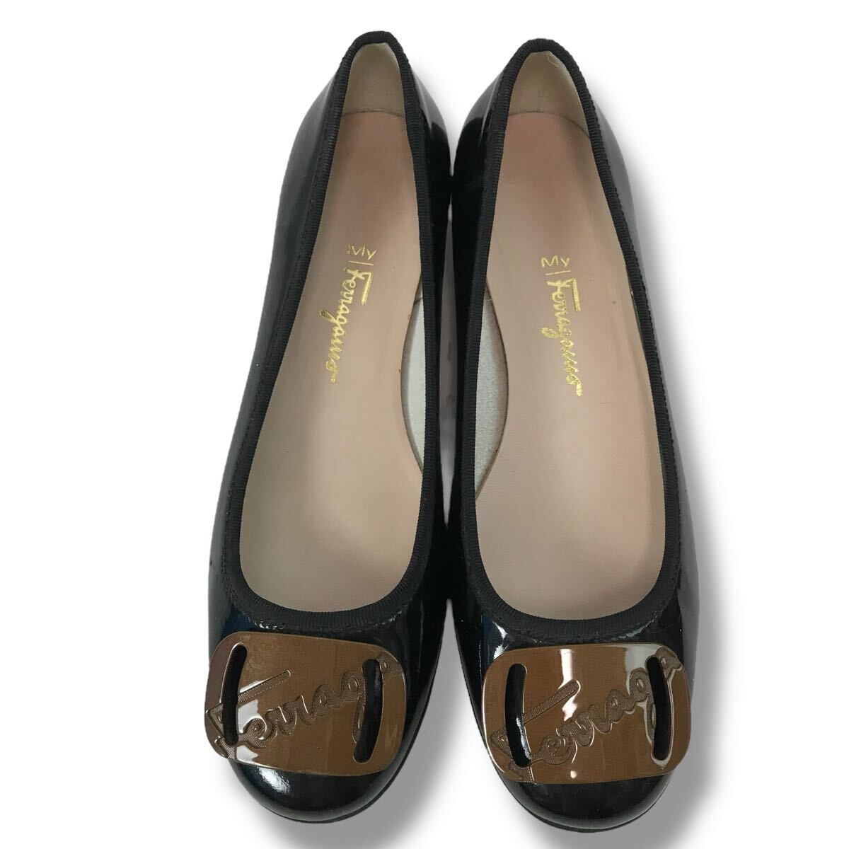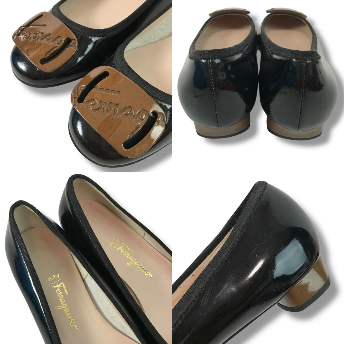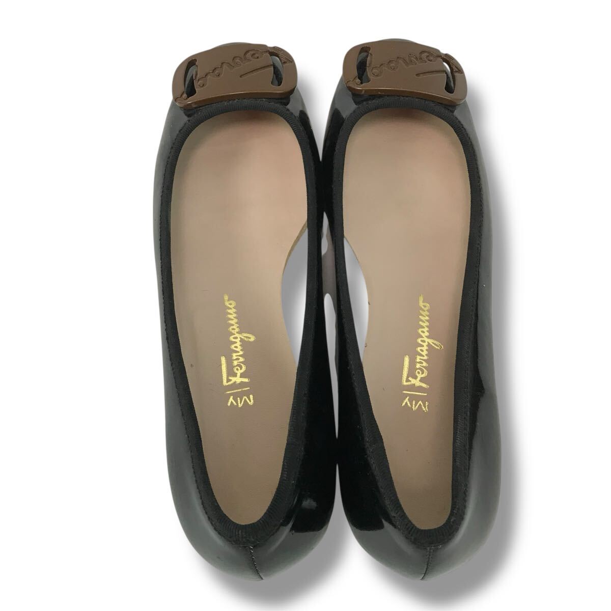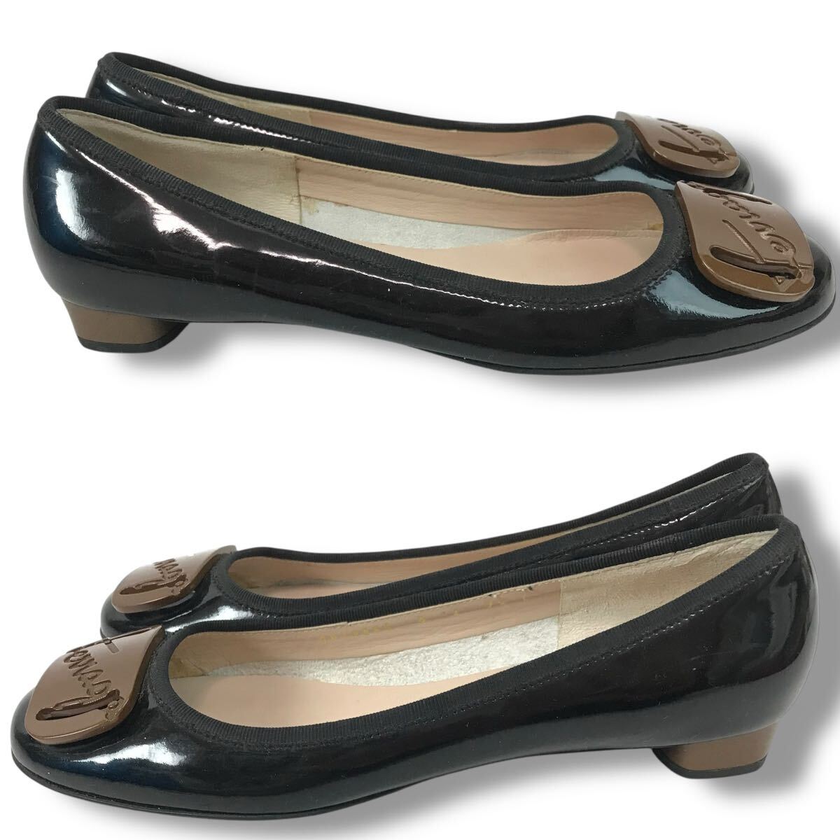 d113 Salvatore Ferragamo サルヴァトーレフェラガモ エナメル レザー パンプス ローヒール シューズ パテントレザー 7.5 ブラック 正規品