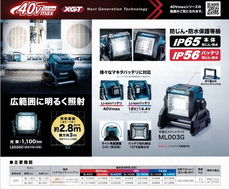 マキタ製の充電式LEDスタンドライトのML003Gです。