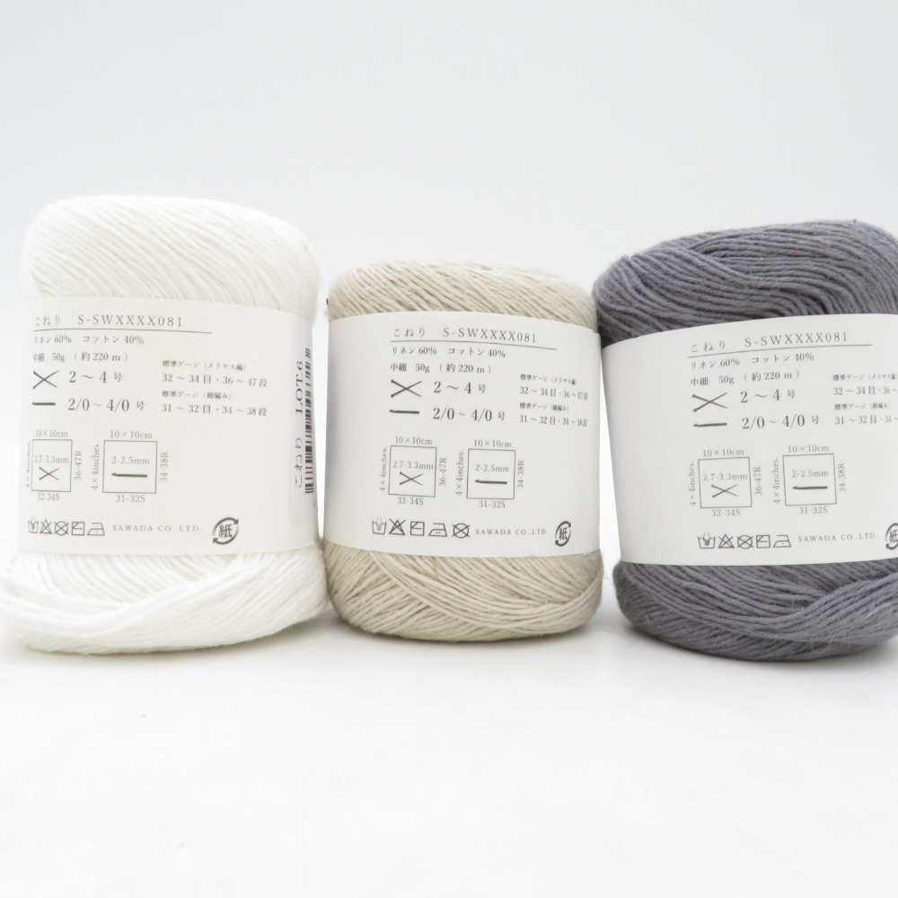 | 毛糸 sawada itto サワダイット こねり 3玉セット 5番色 和三盆 1番色 すずらん 3番色 水墨 約50g リネン コットン 中細 日本製 未使用 |