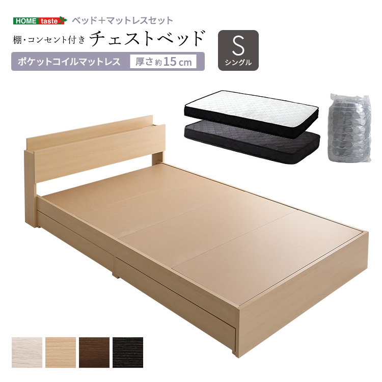 棚・コンセント付きチェストベッド ポケットコイルマットレスセット(シングル) ウォールナット/ブラック