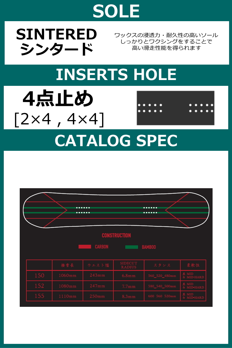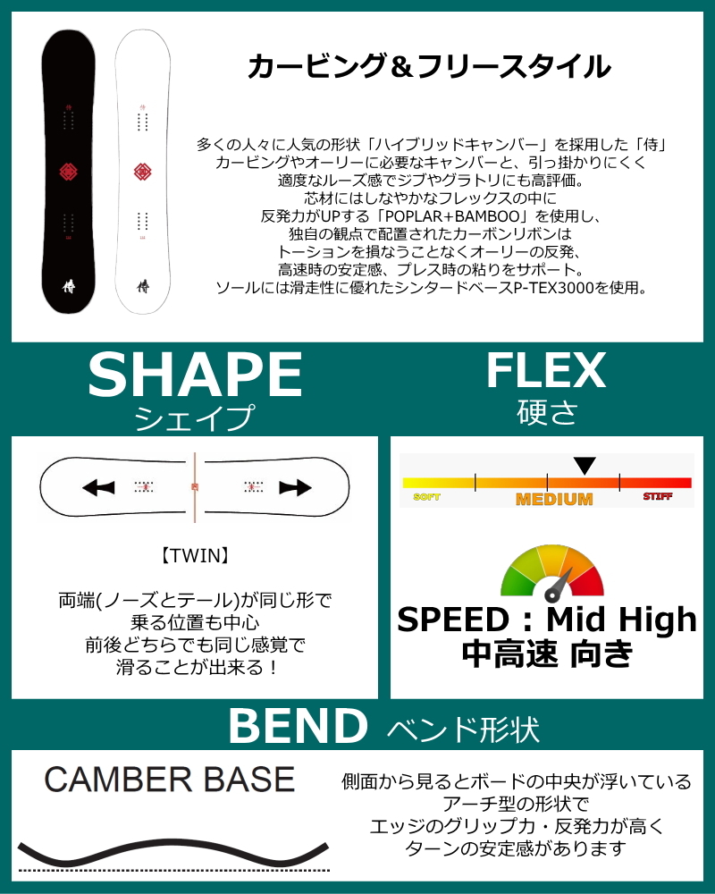 多くの人々に人気の形状「ハイブリッドキャンバー」を採用した「侍」カービングやオーリーに必要なキャンバーと、引っ掛かりにくく適度なルーズ感でジブやグラトリにも高評価。芯材にはしなやかなフレックスの中に反発力がUPする「POPLAR+BAMBOO」を使用し、独自の観点で配置されたカーボンリボンはトーションを損なうことなくオーリーの反発、高速時の安定感、プレス時の粘りをサポート。ソールには滑走性に優れたシンタードベースP-TEX3000を使用。