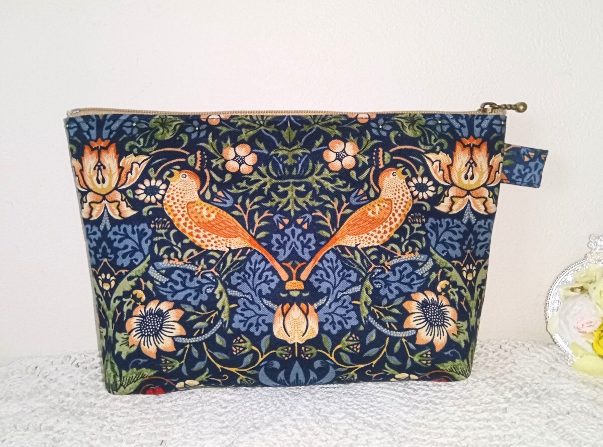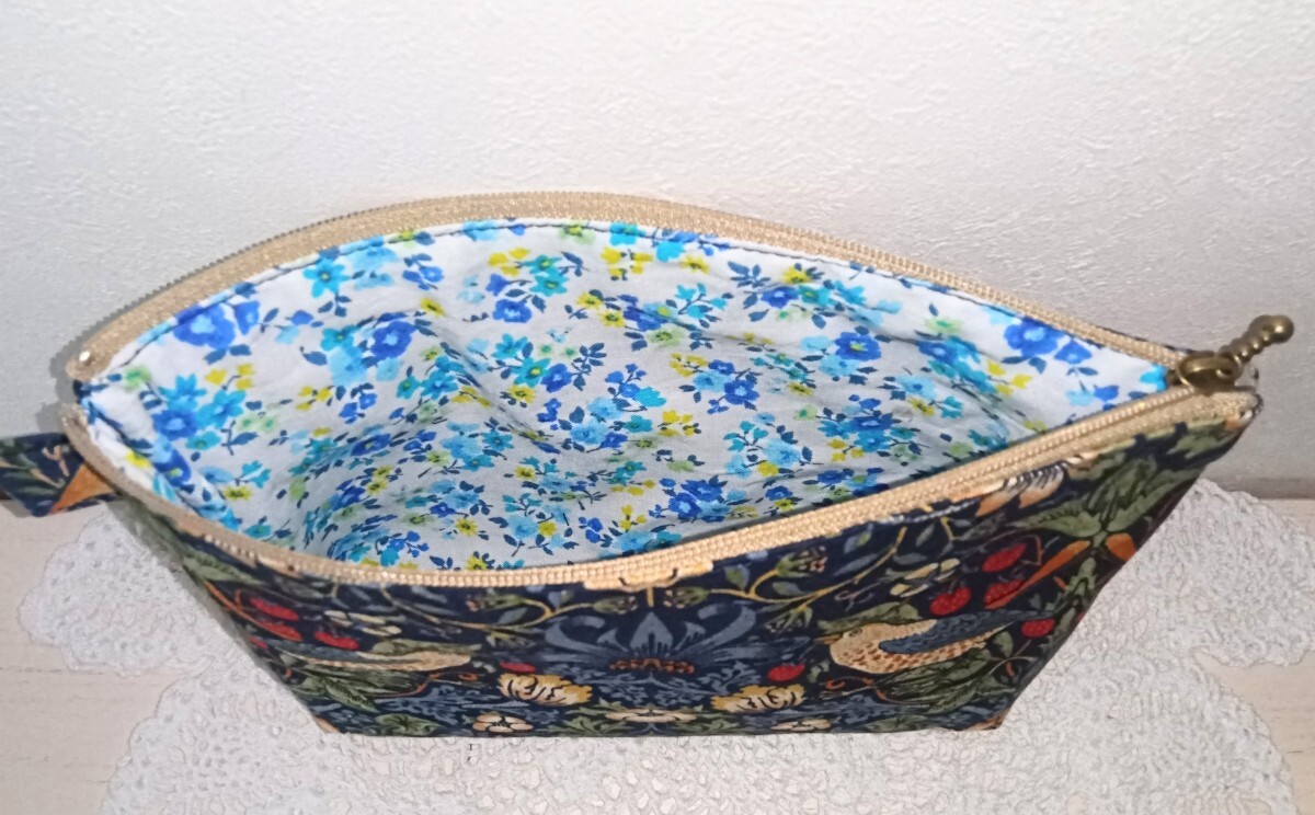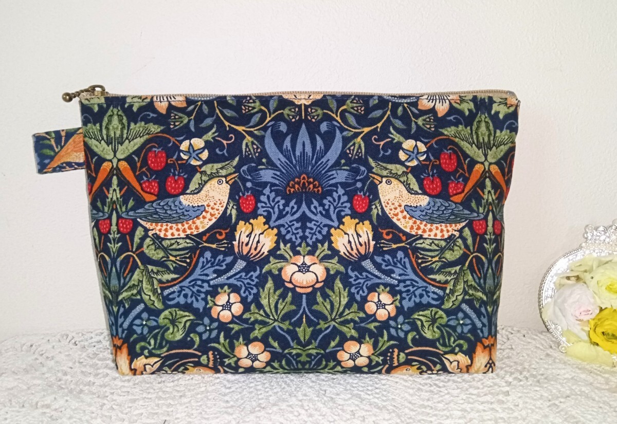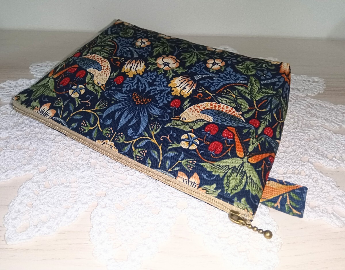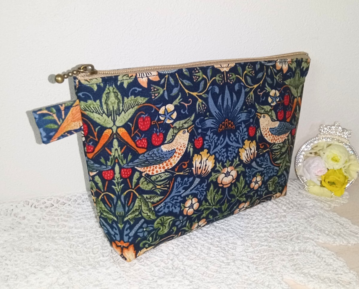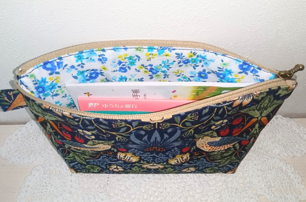 ・マルチックブルー(ネイビー地)いちご泥棒、マチ付きファスナーポーチです♪