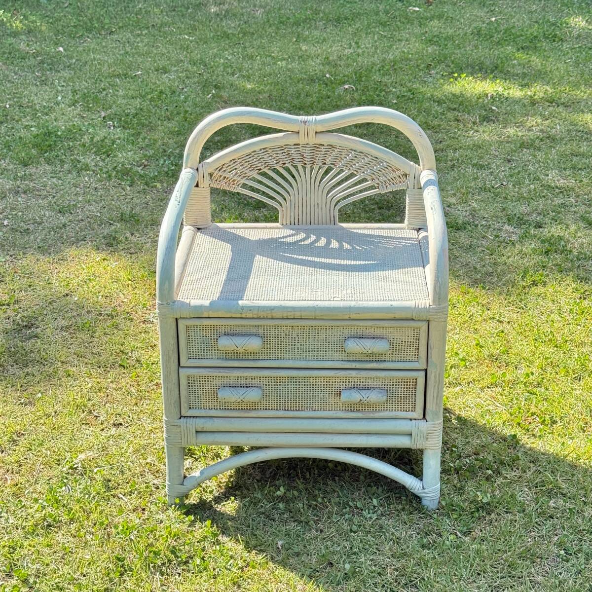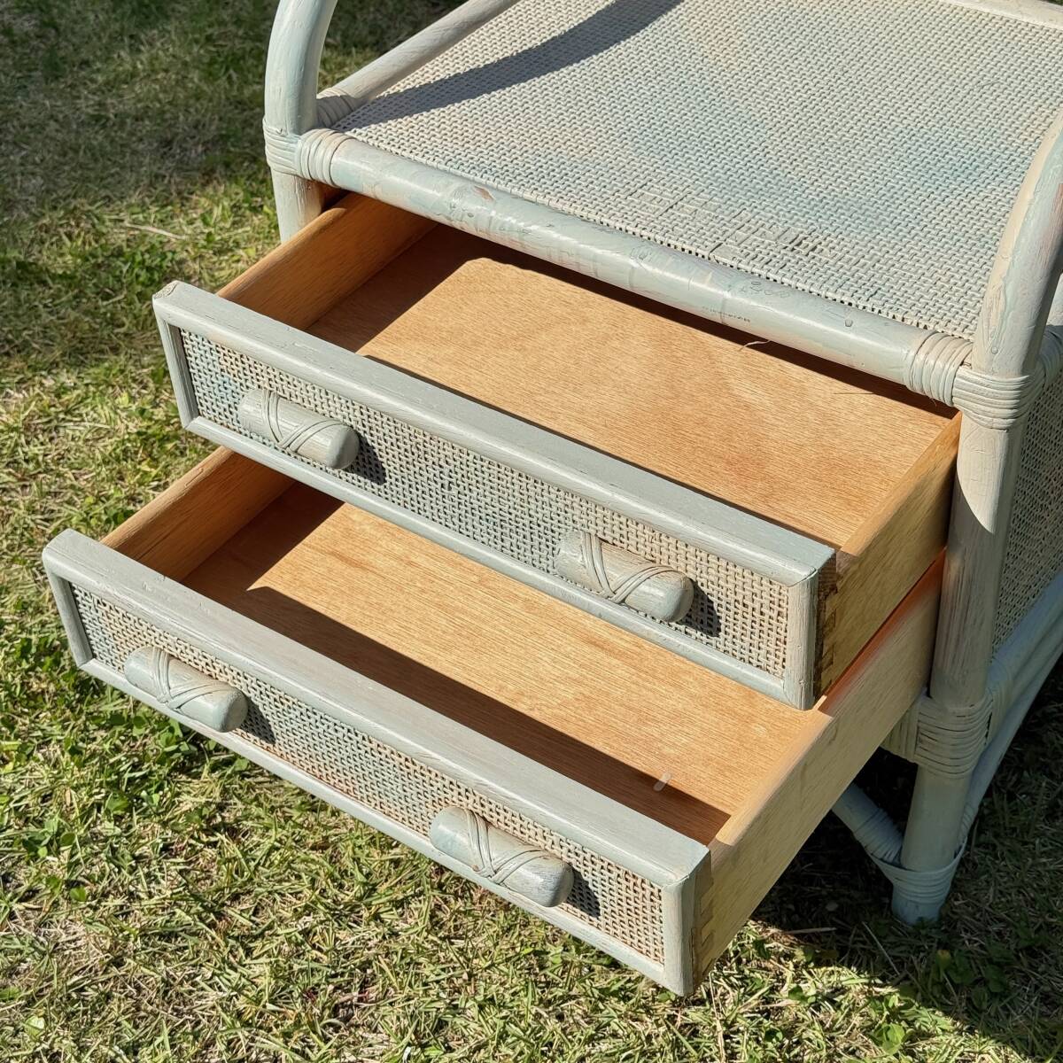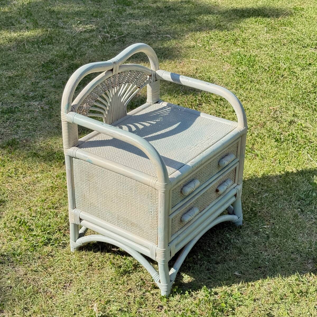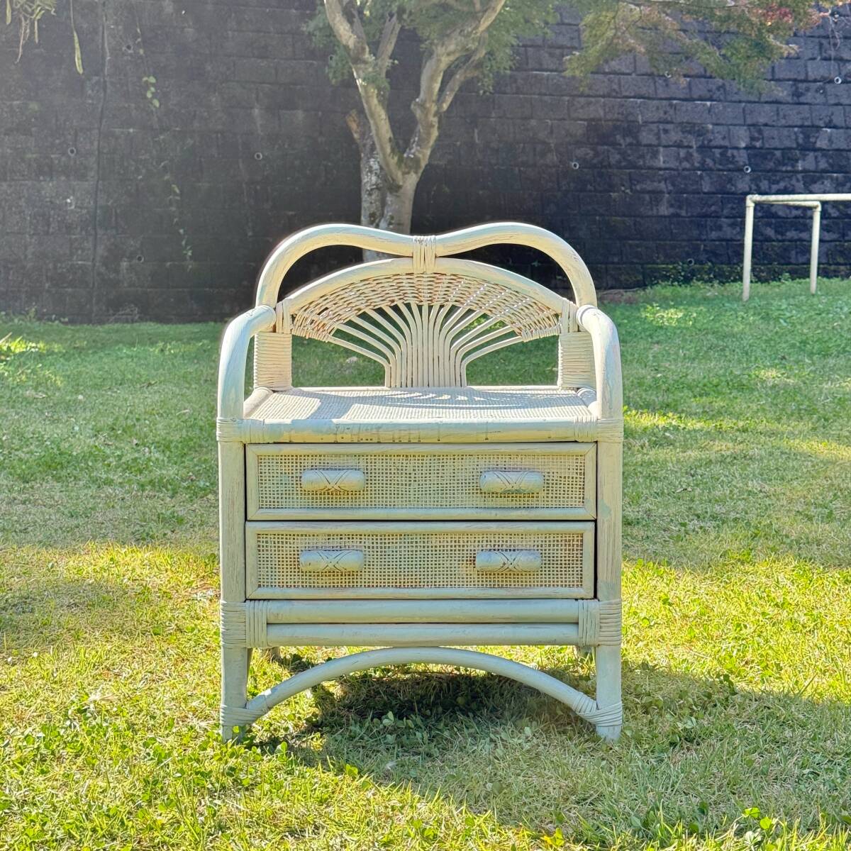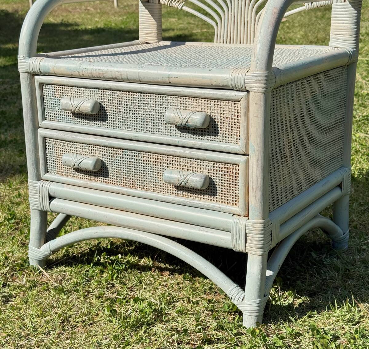 ビンテージ ラタン製 ホワイト・ペールブルーのペイントがお洒落なミニチェスト 籐家具 ナイトテーブル サイドチェスト 幅50.5㎝ 高さ65㎝