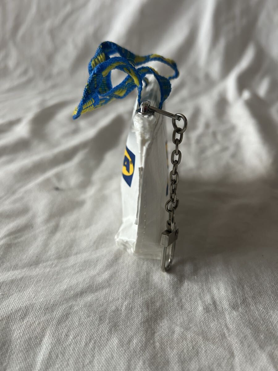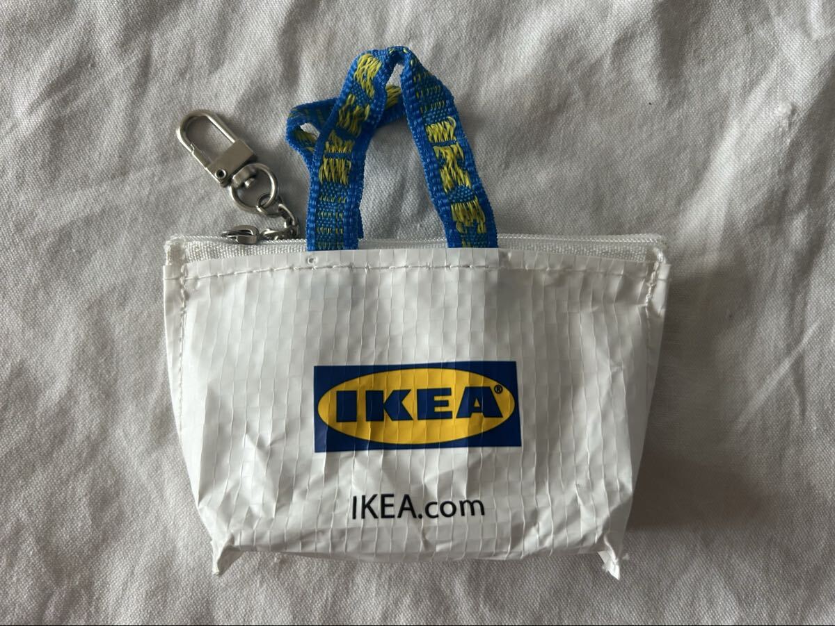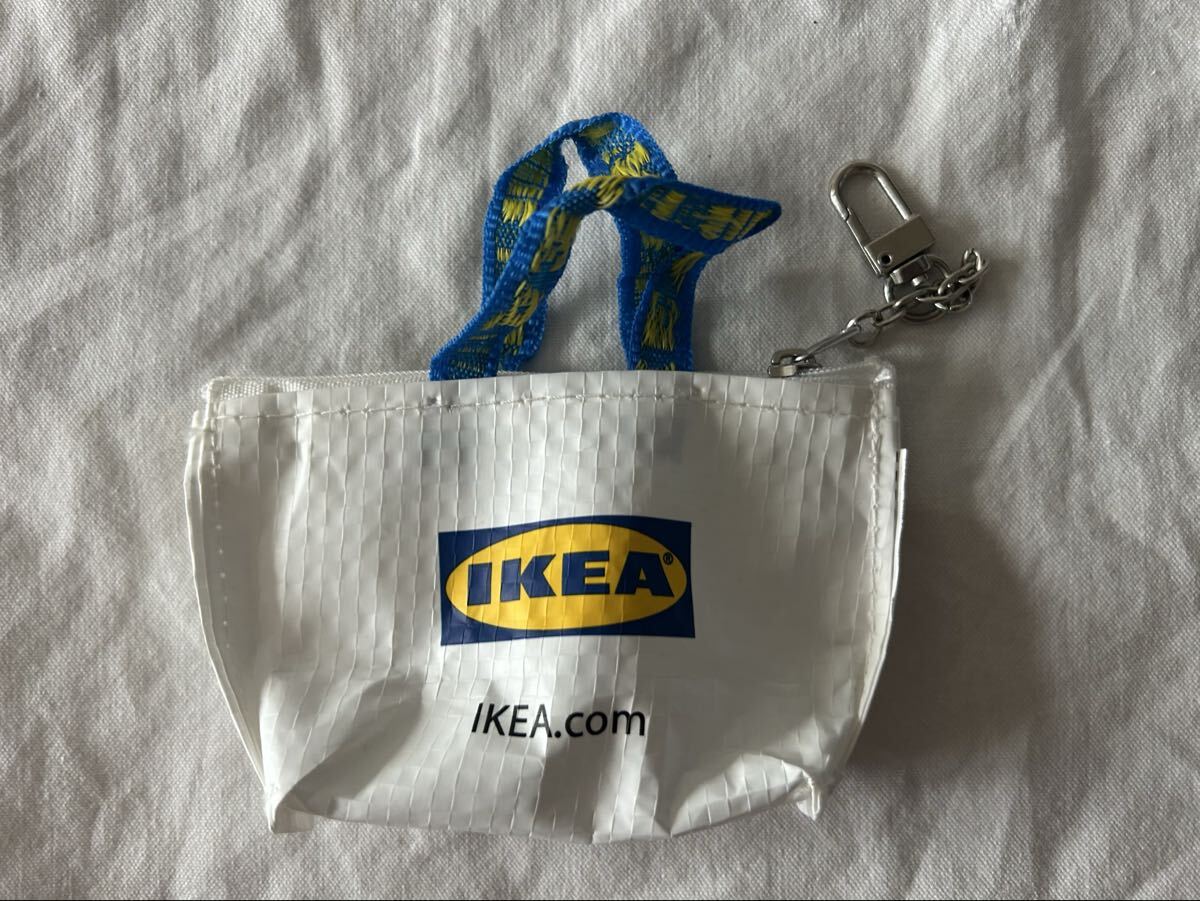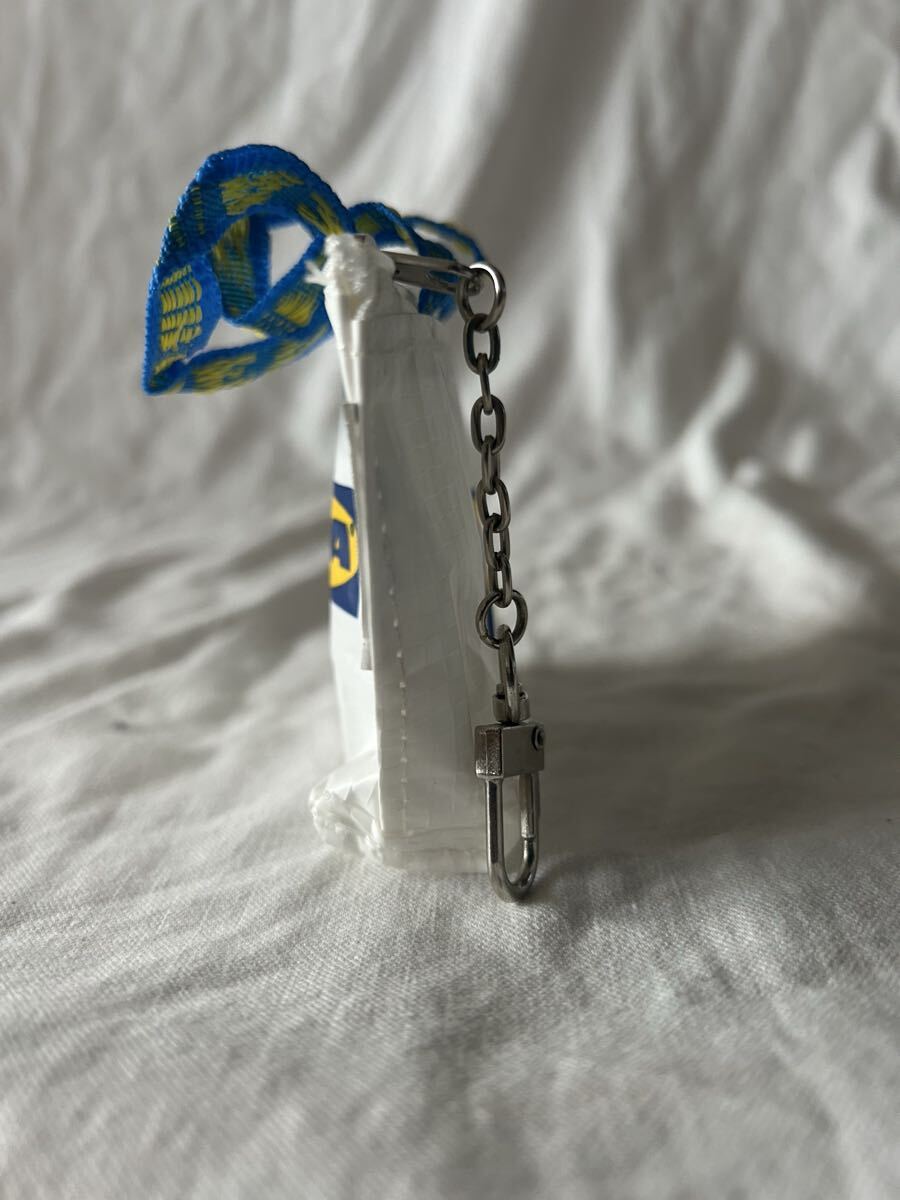 IKEAのミニトートバッグ型キーホルダー、ナイロン製でカラビナ付き。