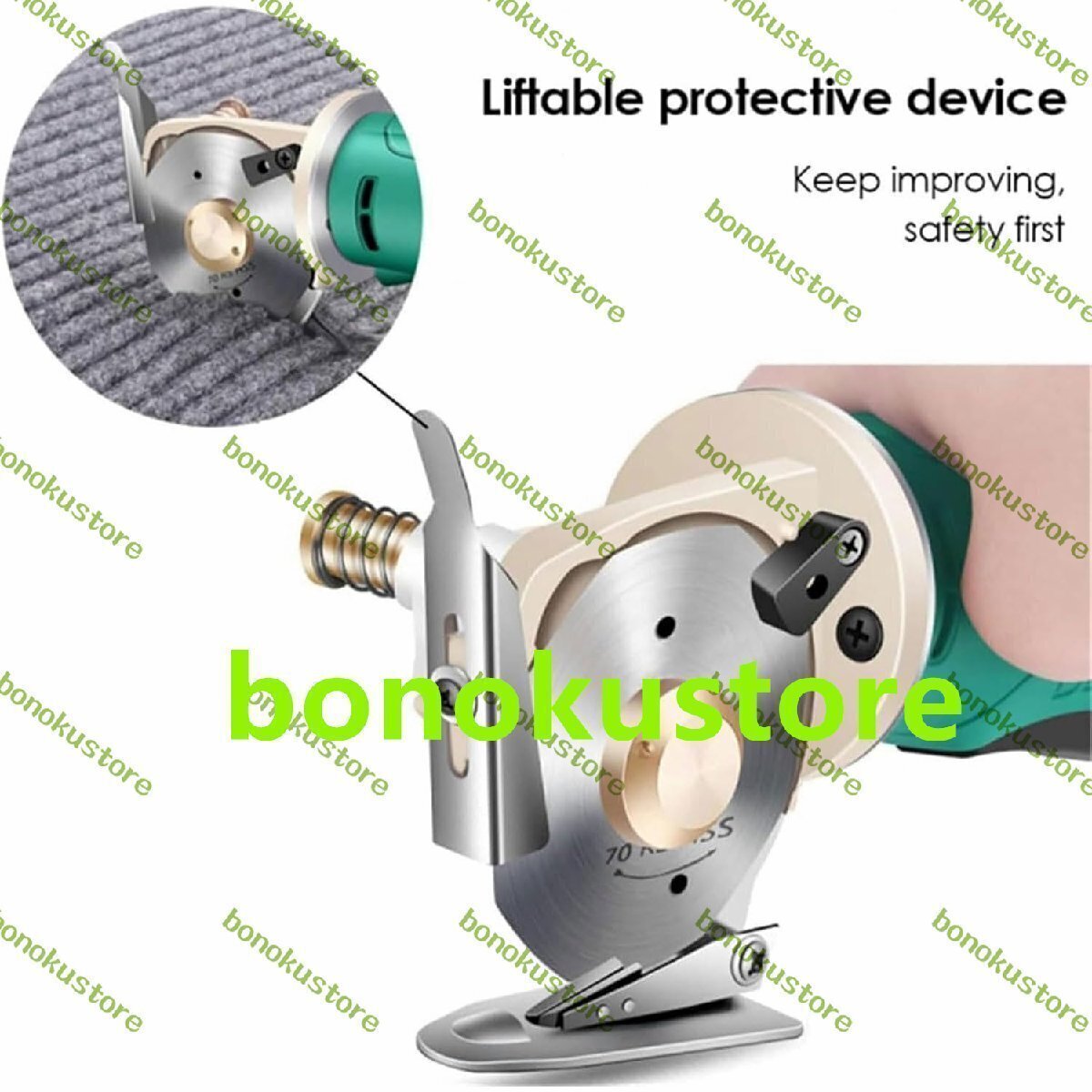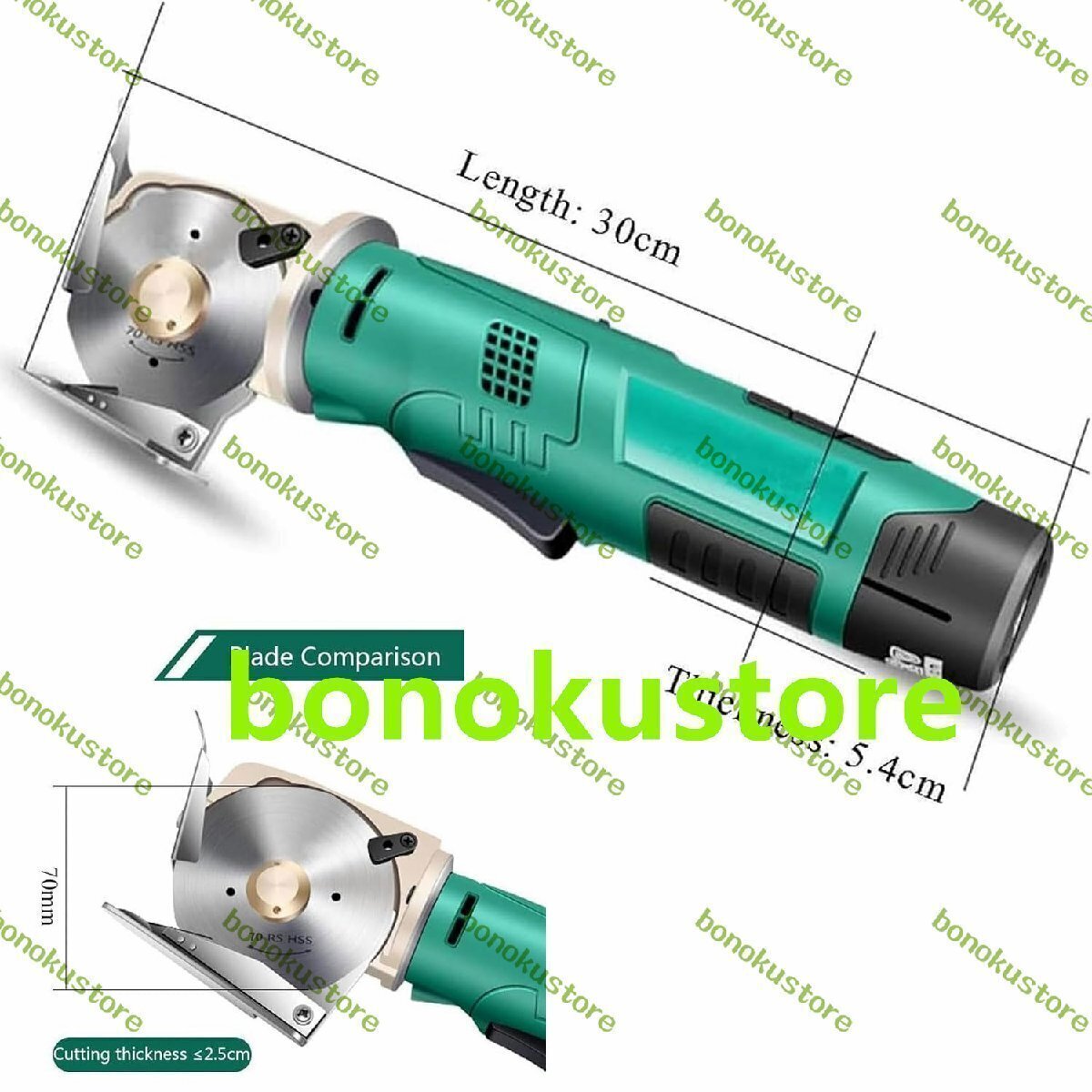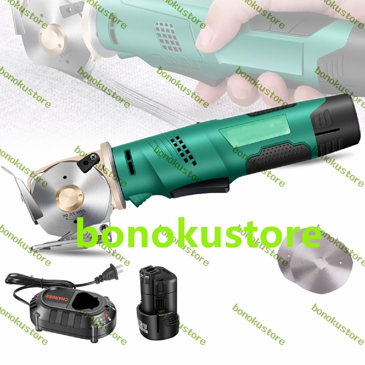 商品の説明 名前: 電動ファブリックカッター 材質: 合金鋼 電力: 200W 電圧: 12V 刃のサイズ:70mm 最大切断厚さ:25mm 刃の形状:丸 パック: 1x 電気布切断機 1x2000mAh リチウム電池 替刃×2 1x 充電器 名前: 電動ファブリックカッター 材質: 合金鋼 電力: 200W 電圧: 12V