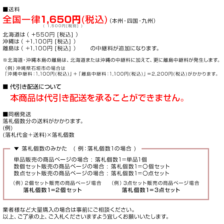 | ▼ 商品に関するお問い合わせはこちら ■対応時間 10:00~15:00 土日祝日休業 ※商品に関するお問い合わせや初期不良等のご連絡はやり取りの履歴を残すために、 お手数ではございますが、必ず下記のメールアドレスにご連絡ください。 jorrp38198@yahoo.co.jp ▼ 営業日・支払い方法・発送・返品・交換・保証に関して ※必ずお読みください 営業日・支払い方法・お届けについて・返品・交換・保証に関する件は、以下のページにて詳しく記載しております。 営業日掲載ページはこちら 営業日カレンダー掲載ページ 支払い方法・お届けについて・返品・交換・保証に関する掲載ページはこちら お買い物ガイド詳細ページ プライバシーポリシーに関する掲載ページはこちら プライバシーポリシー記載ページ ▼ 質問が多かった即決落札について 即決で落札する方法 即決で落札するには ├PC版の場合は、商品画像右の「今すぐ落札する」をクリックします。 └スマホ版の場合は、(1)「入札する」をタップします→(2)最高入札額記入欄に、即決の金額(税抜)をご記入頂ければ即決できます。 入札→即決落札した場合の履歴に関して ご入札頂いているYahoo_IDで即決価格で再度ご落札して頂ければ、前の入札の履歴は残りますが前の分はキャンセルとなり、即決価格のみでのご落札となります。重複しませんのでご安心ください。 ▼ オークションに関して 入札後の各種確認メールについて 当店からの受注確認メール・入金確認メール・発送確認メールが「迷惑メールフォルダ」に自動で振り分ける場合がございます。 「フォルダを空にする」前にメールが届いているか一度ご確認ください。 ご落札の際は、以下3つの当店メールアドレスが届くように受信設定をお願いいたします。 tantobazar@weiec.jp tanto_bazar@yahoo.co.jp jorrp38198@yahoo.co.jp 当店からの各種確認メールは、オーダーフォームに登録のメールアドレス宛に送信されます。 取引方法 手渡しでの直接取引には対応できません。物流業務を委託していますので、 お近くにお住まいの方でも商品のお受け取りに来ていただくことはできません。 在庫について 当社では、卸販売など各方面でも商品を同時販売しております。 在庫情報は随時更新(新規出品の停止、個数少数での出品、出品取り消しなど)させて頂いておりますが、ご落札頂いた際に時間差などで売り切れになる場合もございます。 予めご了承ください。 キャンセル 入札後のキャンセルは一切お受けできません。 やむを得ぬ事情により落札後キャンセルをされる場合には、落札者都合によるキャンセルとなり、 オークションのシステム上自動的に落札者にマイナス評価がつきます。 ご了承ください。 落札後3日以内にご連絡が取り合えないお客様についてはやむを得ずキャンセル処理をさせていただく場合もあります。 交換返品返金について お客様都合での、交換・返品・返金は一切対応できません。 評価について 著しく評価の悪い方の入札はご遠慮願います。 領収書発行について 商品代引きご利用の場合は、伝票が領収書となりますので、別途領収書の発行はできません。 領収書発行希望のお客様は入札後、オーダーフォーム要望欄に必ず「領収書発行希望」をご記入の上ご連絡ください。 商品の価格について 当サイトでは、正確な価格表示に努めておりますが、万が一表示価格やご注文商品の金額に誤りがあった場合、誤表記を理由にご注文を取り消させていただくことがございます。 取り消しに際し、お客様にはメールにて販売価格をお知らせしご注文を継続されるか否かのご確認をさせていただきます。 なお、これによりお客様にご不便やご迷惑をおかけした場合でも、直接的または間接的な損害についての補償は致しかねますことを、何卒ご理解のほどお願い申し上げます。 |