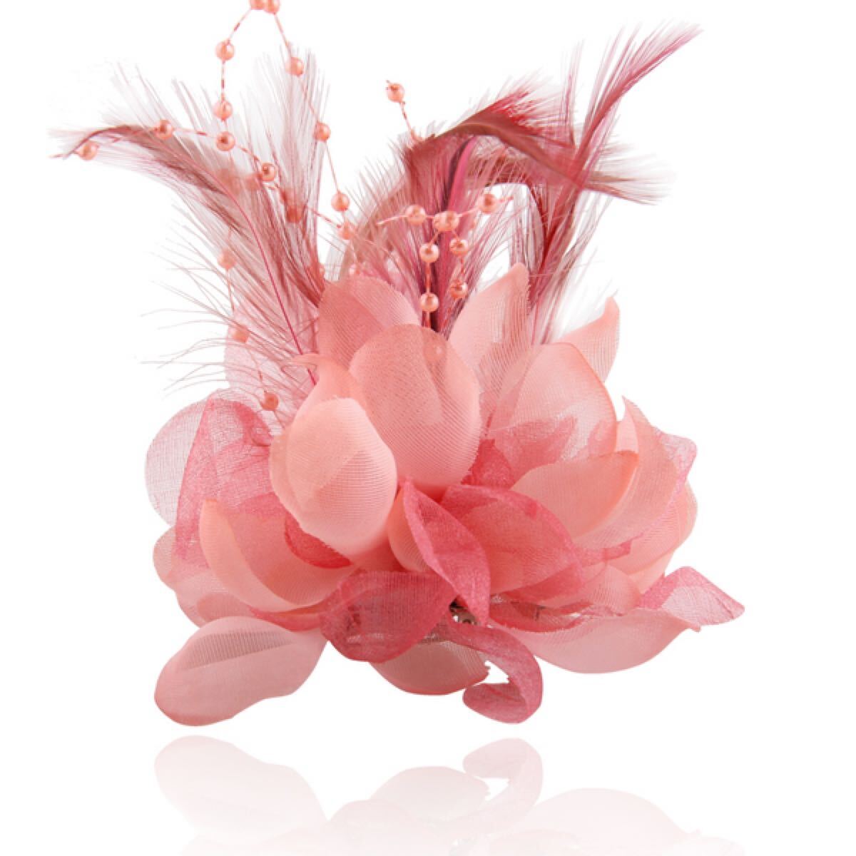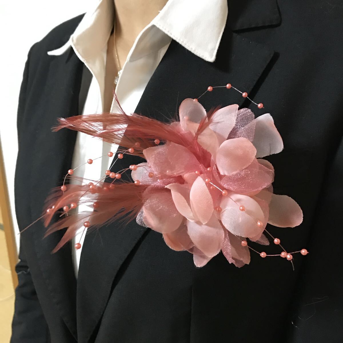 女性らしく可愛らしい雰囲気をかもし出すピンクのコサージュ。