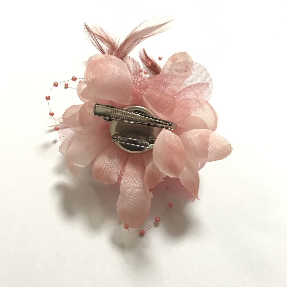 ピンとクリップの2つの留め具がついているため、髪やバッグに飾ることもできます。