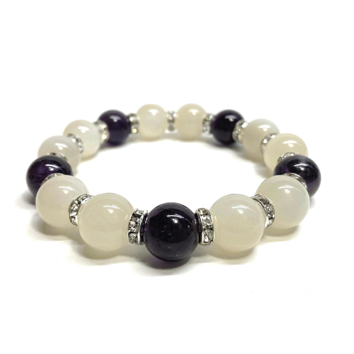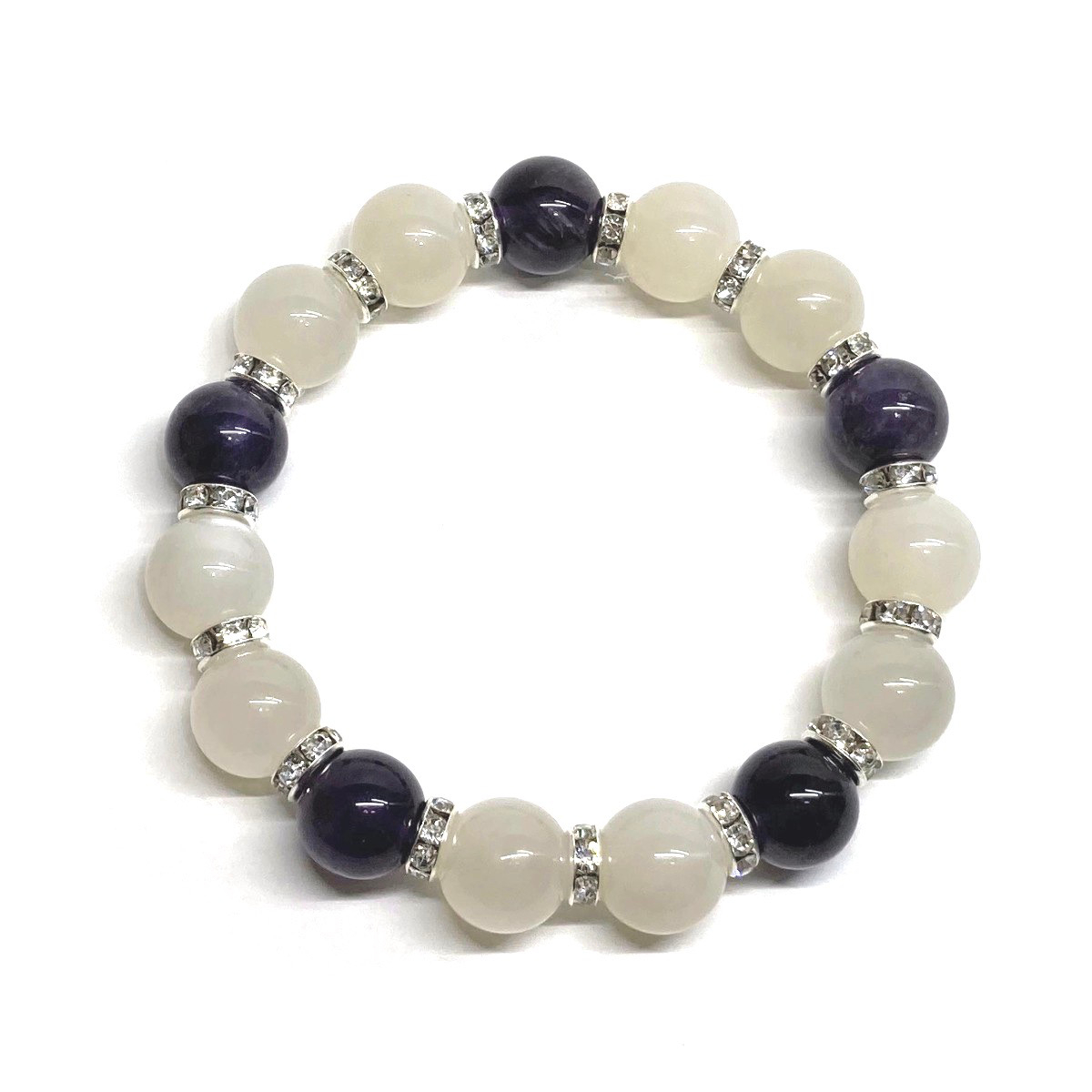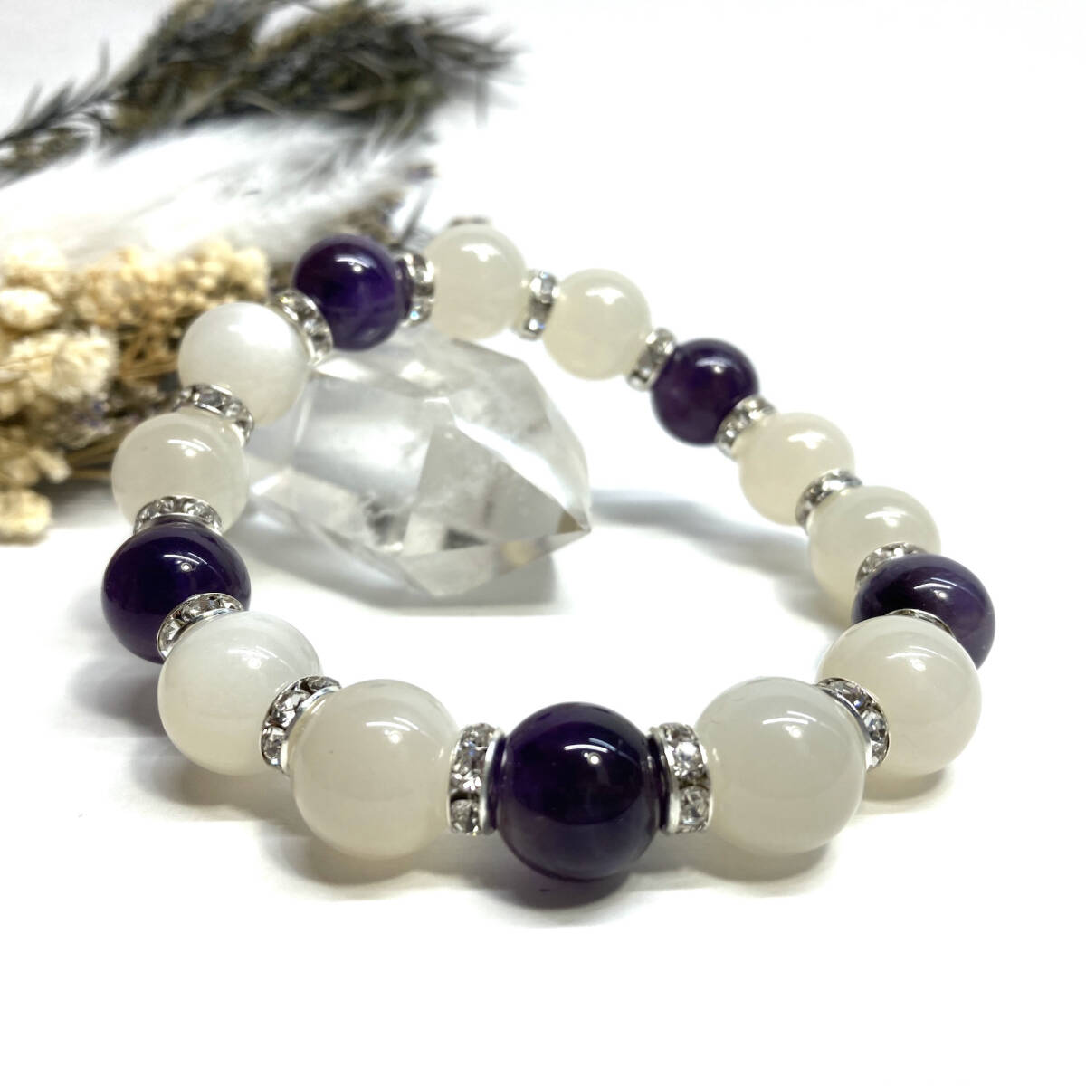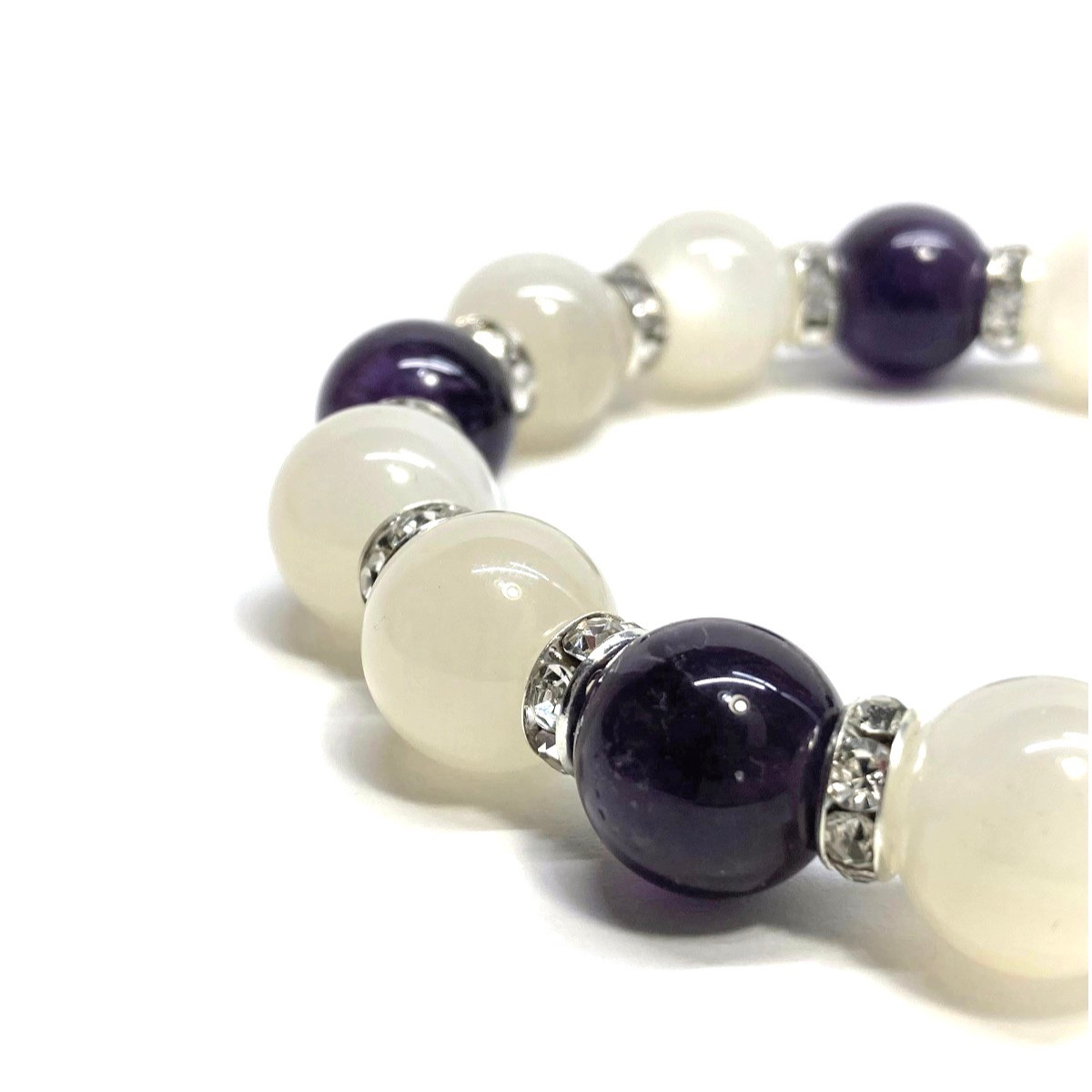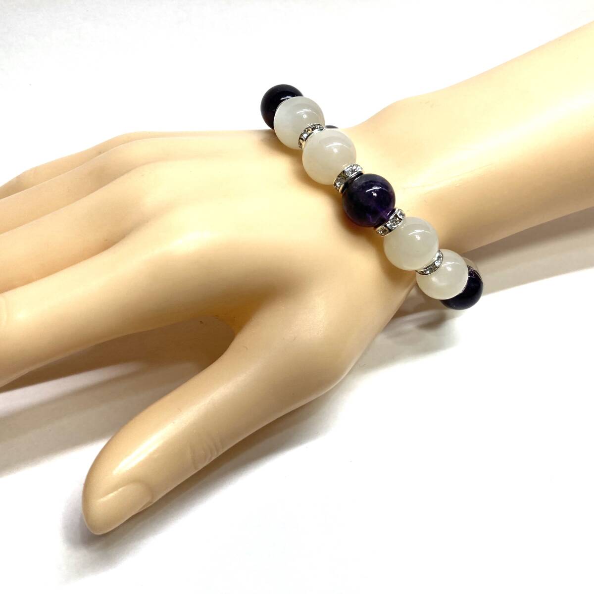こちらは、ムーンストーンとアメジストを組み合わせたパワーストーンブレスレットです。間にはロンデルを挟み高級感あるデザインに仕上げております。程よくインパクトがある12mm玉を使用して内周約18cmです。(サイズ変更の場合は取引ナビにてご連絡をお願いします。) 数に限りがございますので気になる方はお早めにどうぞ。
