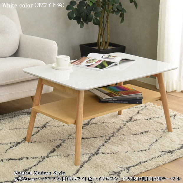 | 【商品名】 | 高さ50cmハイタイプ木目柄ホワイト色ハイグロスシート天板中棚付折脚テーブル | |