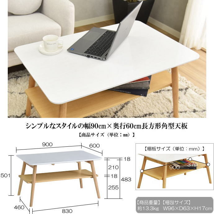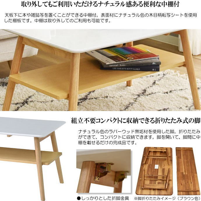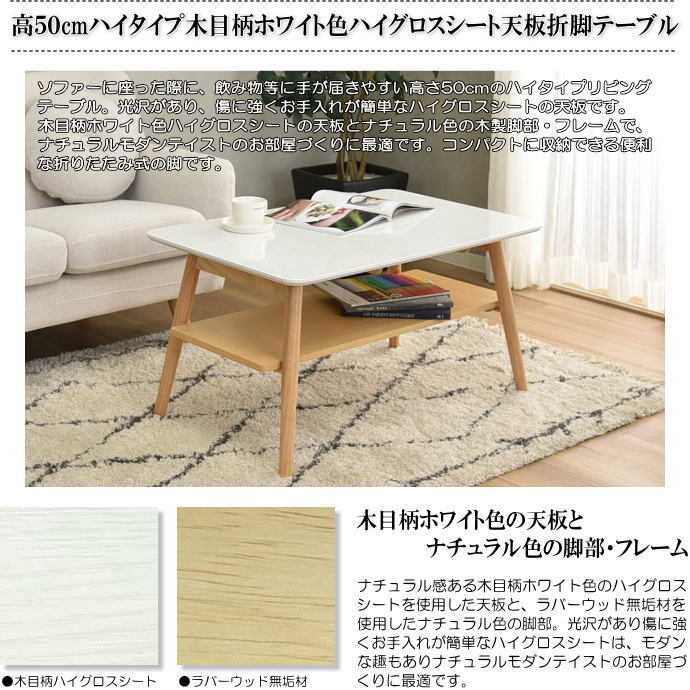 | 【商品特徴】 | ・ソファーに座った際に、飲み物等に手が届きやすい高さ50cmのハイタイプのリビングテーブルです。 ・ナチュラル感ある木目柄ホワイト色のハイグロスシートを使用した天板と、ラバーウッド無垢材を使用したナチュラル色の脚部です。 ・光沢があり傷に強くお手入れが簡単なハイグロスシートは、モダンな趣もありナチュラルモダンテイストのお部屋づくりに最適です。 ・天板下に本や雑誌等を置くことができる中棚付。表面材にナチュラル色の木目柄転写シートを使用した棚板です。中棚は取り外してのご利用も可能です。 ・ナチュラル色のラバーウッド無垢材を使用した脚。折りたたみができて、コンパクトに収納できます。脚を開いて、脚間に中棚を載せるだけの完成品です。 ・重量約13.3kgの軽量で、移動や収納が楽にできます。 ・シンプルなスタイルの幅90cm×奥行60cm長方形角型天板です。 | |
