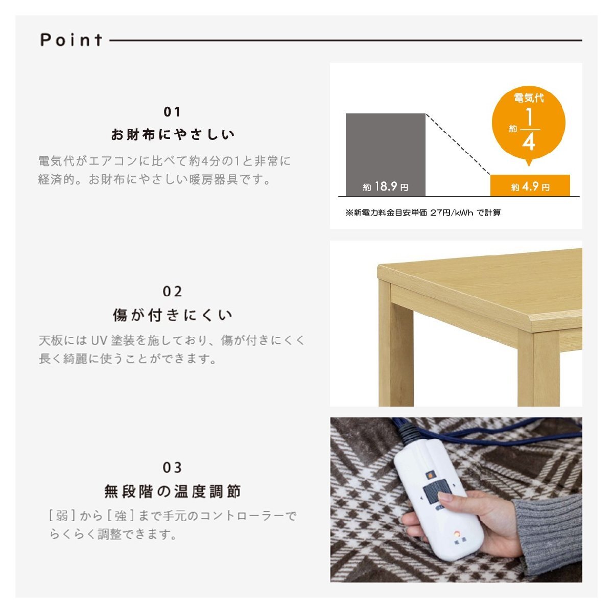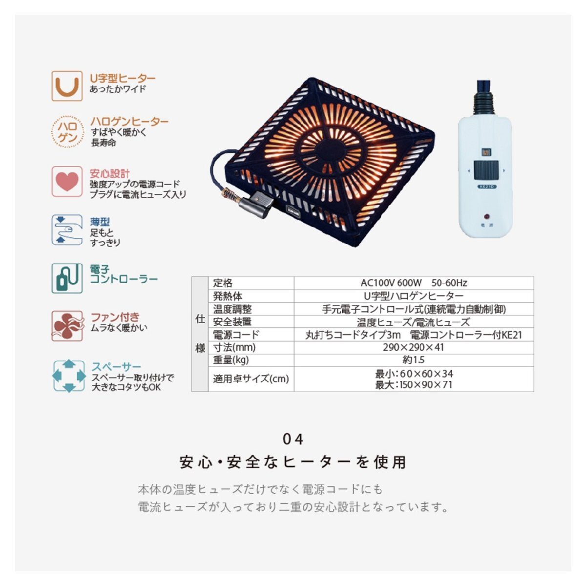 ヒーターは薄型設計でこたつ内部もゆったり広々、U字形ヒーターなので効率的に暖め、速熱・速暖で快適です。温度ヒューズ、電源コードには電流ヒューズを内蔵で念を入れた安全性の高い安心設計。