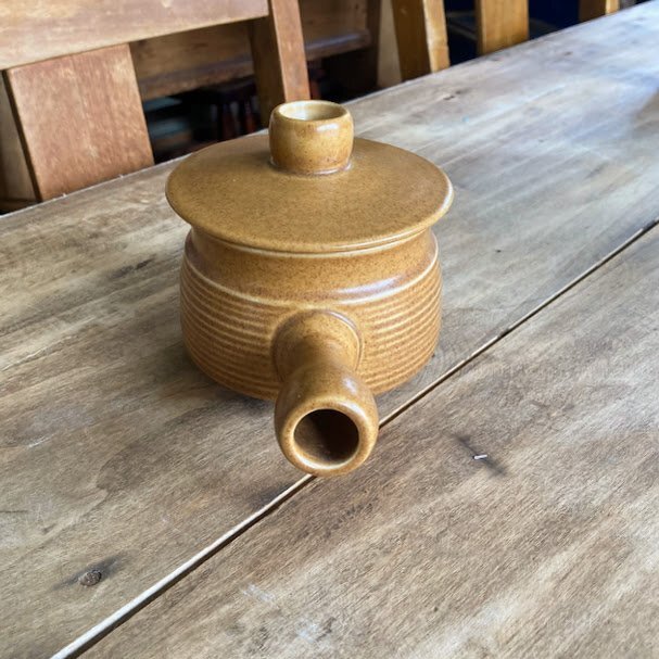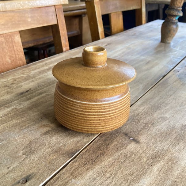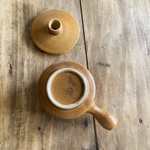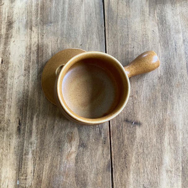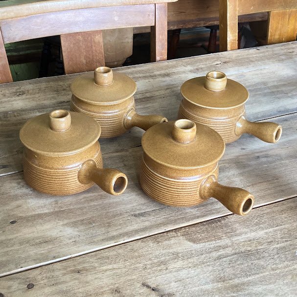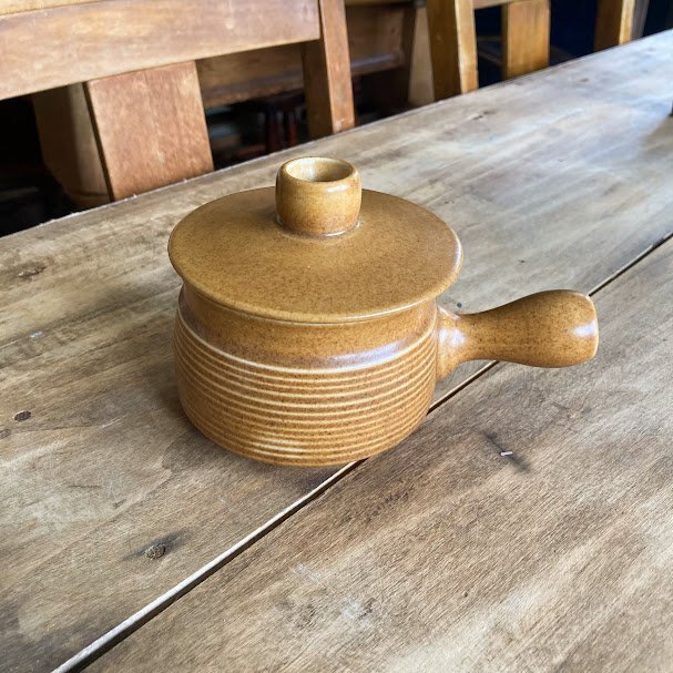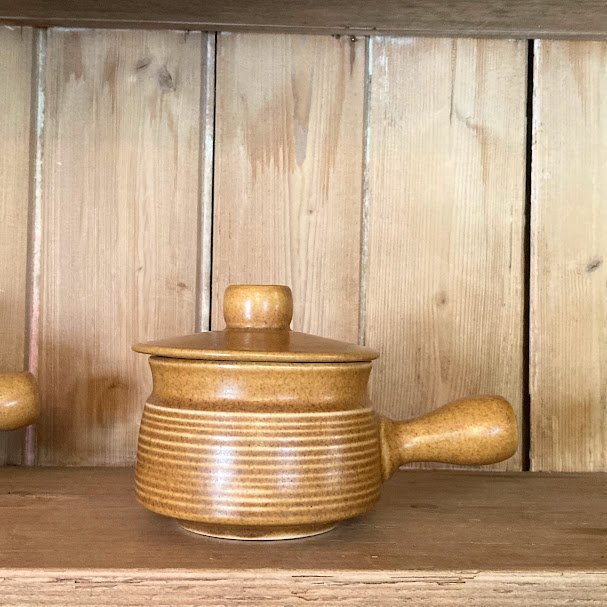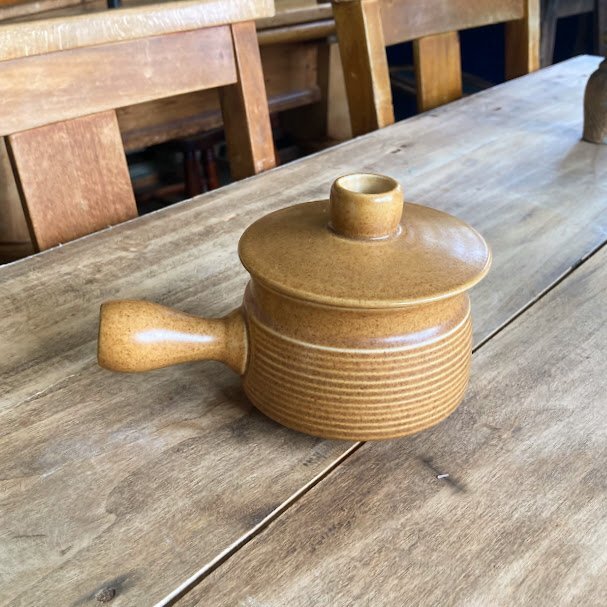 その耐久性とシンプルで素朴なデザインで知られているイギリスDENBY/Langley蓋付きのスープボウルが届きました【43-3111970年代。オニオンスープや土瓶蒸しなどさまざまなお料理にも使えますし、お気に入りの小さなアイテムを可愛らしく保管してもよさそうです。蓋の中央には径5mmほどの穴が開いています。こちらは1個での出品となりますが、同デザインのアイテムが4個ありますので、ご希望の方はお知らせください。福岡市南区の店舗にてお渡しもできますのでお気軽にどうぞ!