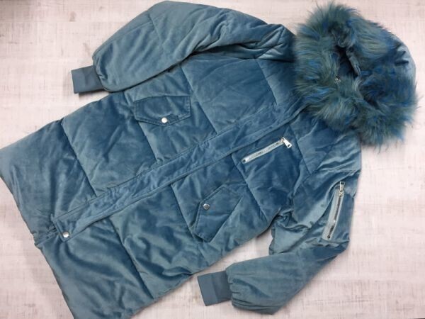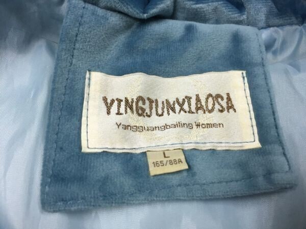 YINGJUNXIAOSA レトロオールド古着 ゴージャス ベロア ロング丈 中綿フーディーコート ファー装飾 レディース ポリエステル100% L 青