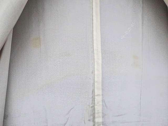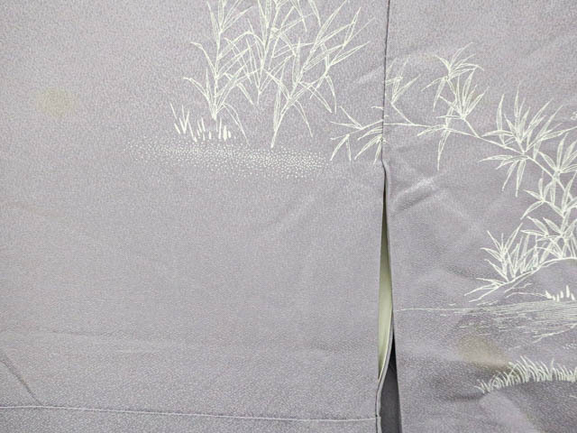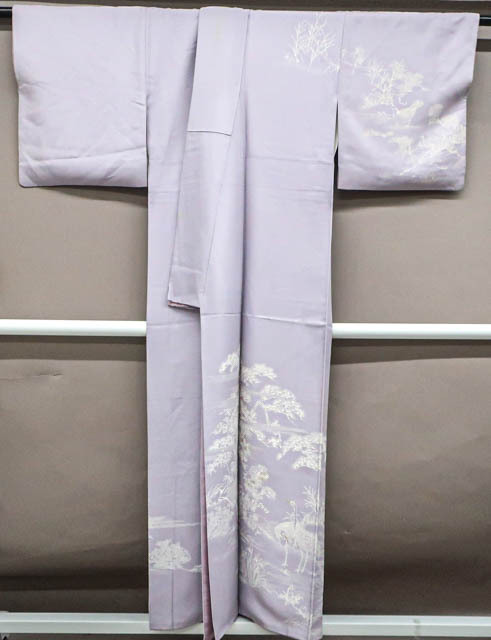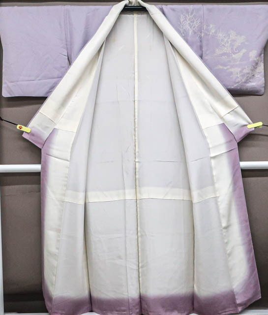 リサイクル商品のため、袖・背・胴裏シミ、衿汚れがございますがご着用いただけると存じます。 地色は薄紫です。 1枚目の画像が近いお色かと思われます。 素材は正絹です。 |