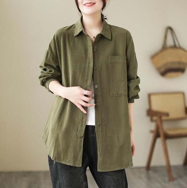 春新品 カジュアル コットン チュニック 素敵な無地 大きいサイズ 長袖 ブラウスシャツ トップス★緑/2XLサイズ