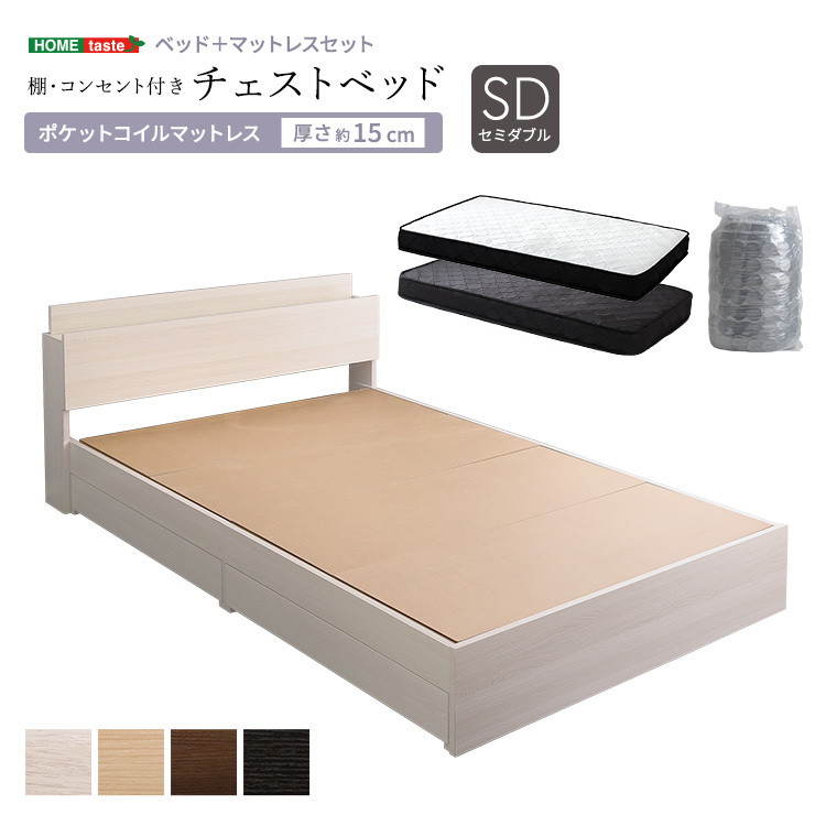 棚・コンセント付きチェストベッド ポケットコイルマットレスセット(セミダブル) ブラックオーク/ホワイト