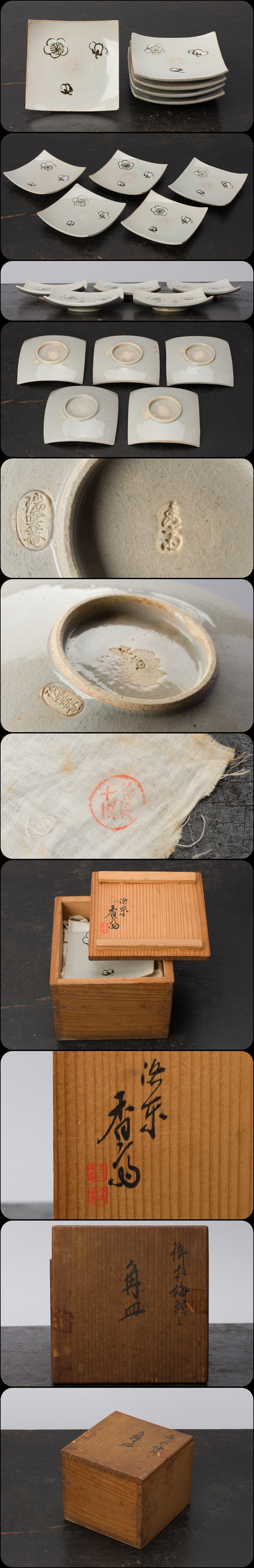 | 洛東香斎、小皿5枚。共箱あり。 小皿には、「香斎」と「瑞雲庵」の印あります。 サイズは、幅約9x9cm、高さ約2cmです。 5枚とも、傷・直しございません。 |