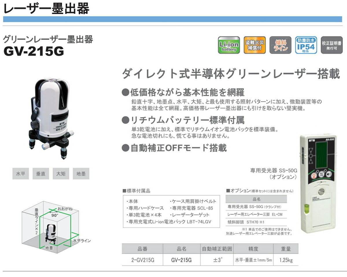 エス・ティ・エス グリーンレーザー墨出器 GV-215G(標準セット)受光器・三脚は別売