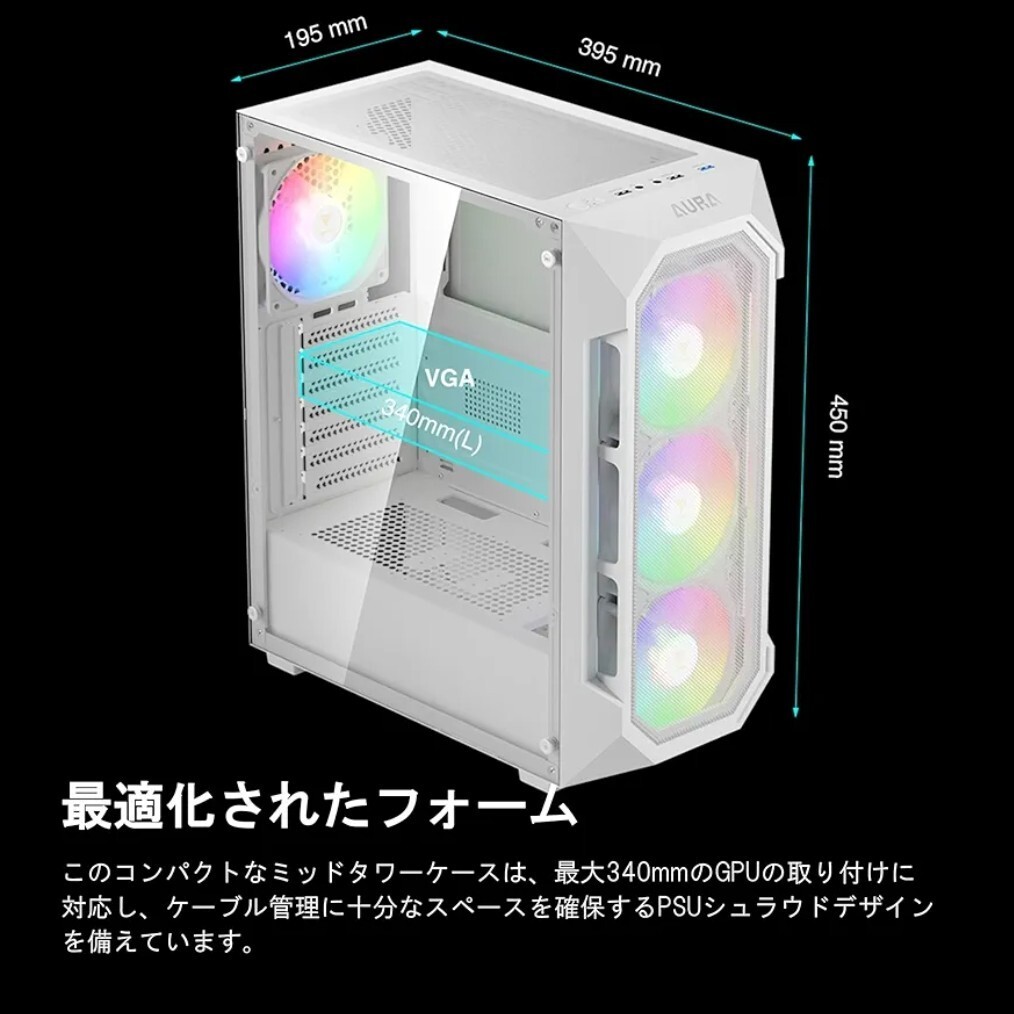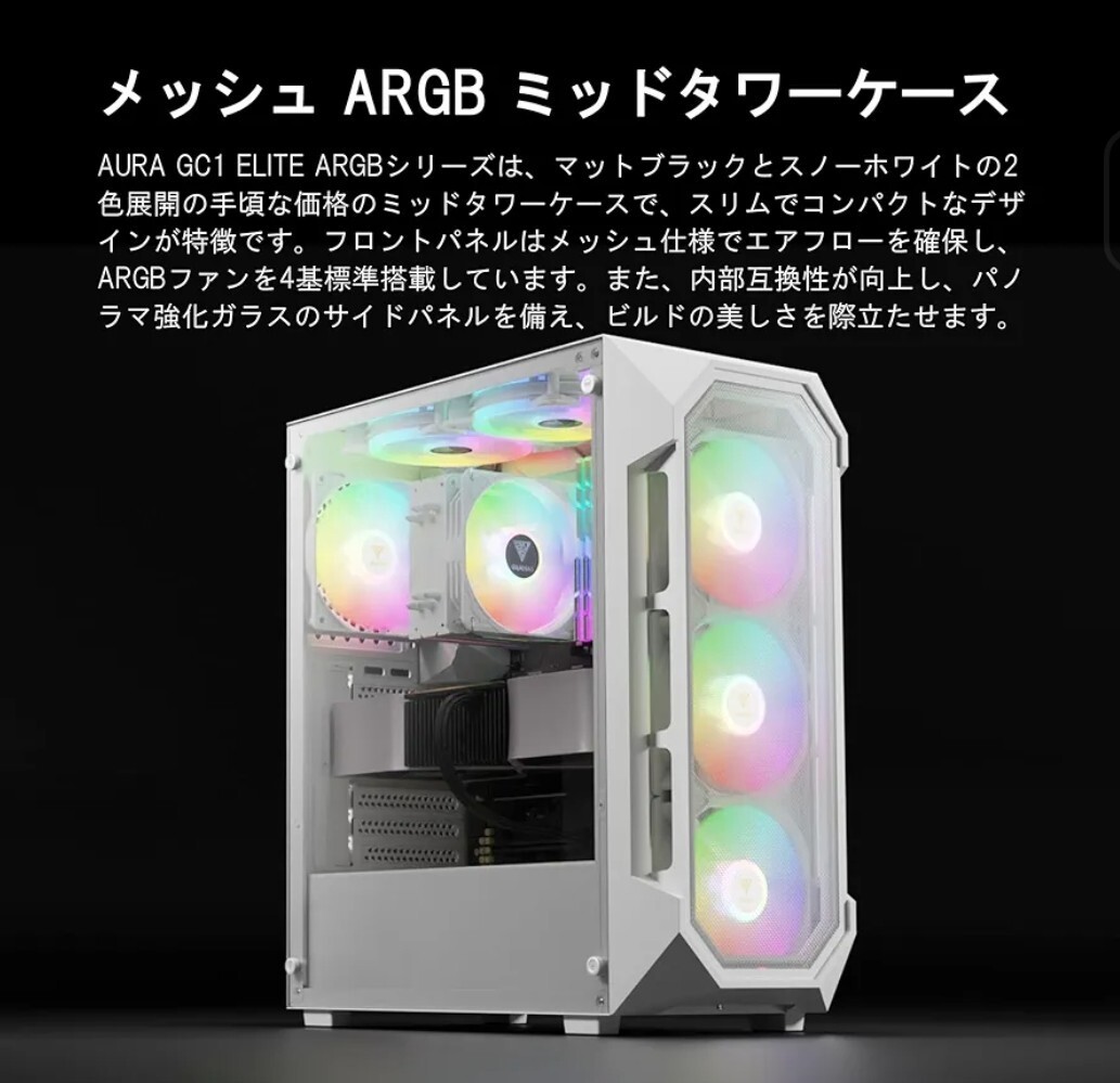 GAMDIAS AURA GC1 ELITE WH ARGB PCケース ホワイトミッドタワー、4つの120mm内蔵ARGBファン、強化ガラスサイドパネル、効率的な冷却、5V ARGBマザーボード同期対応、ゲーミング&カスタムPC向け