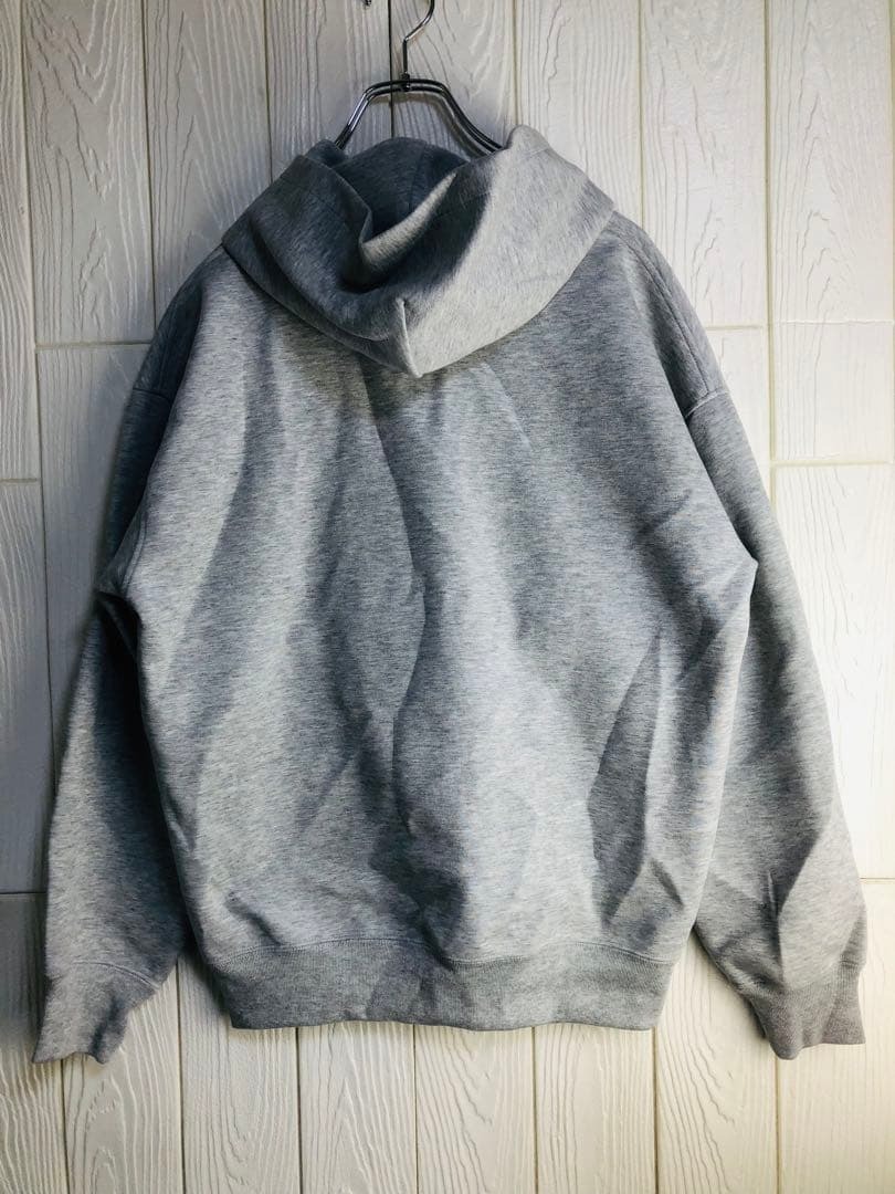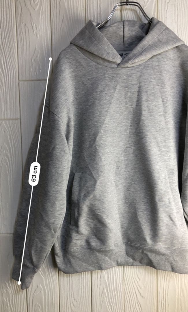 シンプルでスタイリッシュなグレーのパーカー、着丈56cm、肩幅42cm。