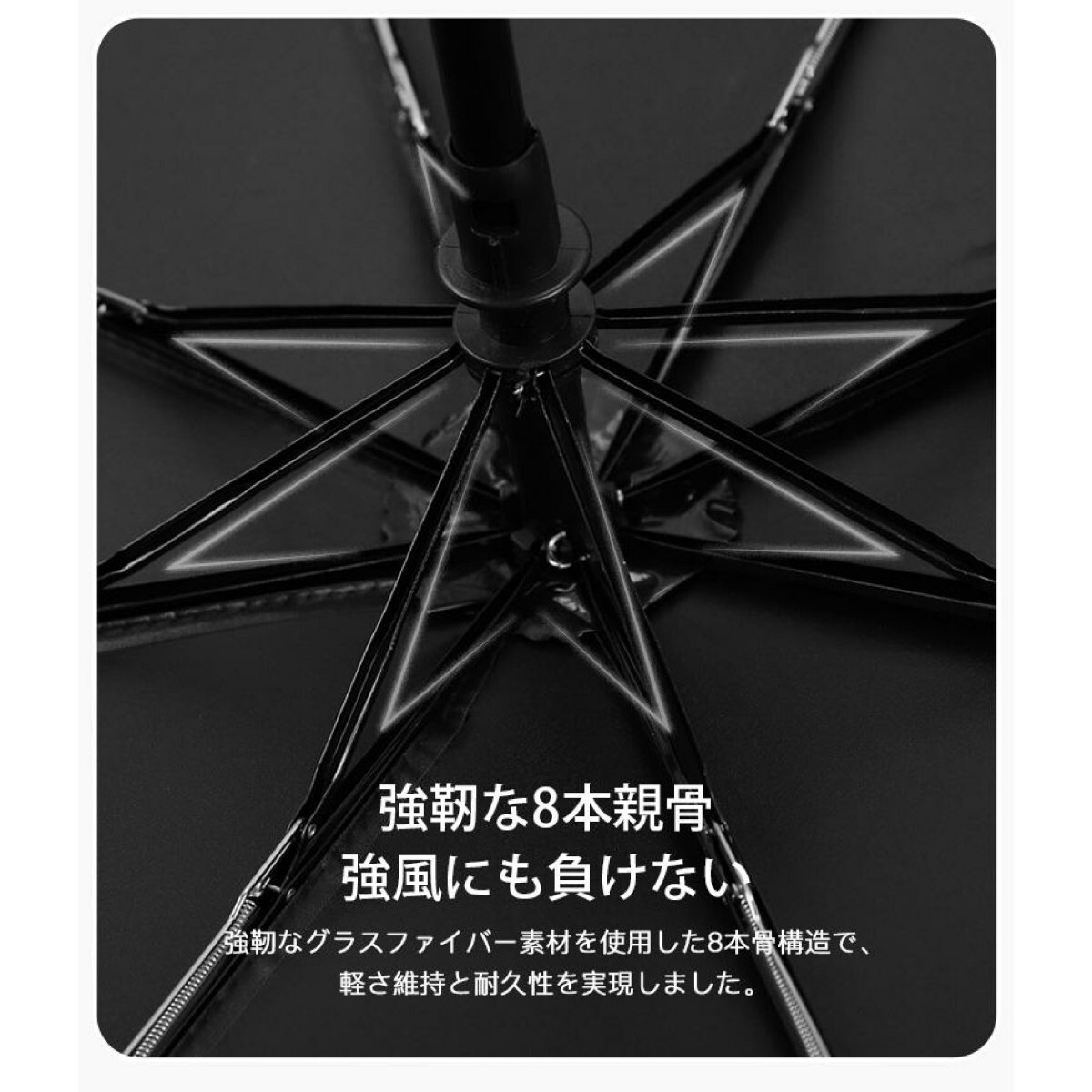 【8本骨折畳み傘】 8本親骨で作られ、柔軟性と強度を併せ持ち、耐風性と耐久性ともに向上させた折りたたみ傘です。防食加工が施された傘のフレームは超強靭で錆びにくいし、強風にあおられても折れたり曲がったりしにくい。空気力学に基づいて風を受け流す構造で設計され、万が一ひっくり返ってしまっても、折りたためばすぐ元に戻ります。風が強い日でも心強い耐風傘です。