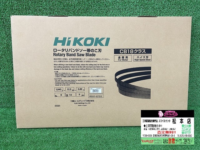 | 商品説明 | ## HiKOKI ロータリーバンドソー帯のこ刃 CB18クラス 0031-8792 HiKOKI製のロータリーバンドソー用の帯のこ刃です。CB18クラスに対応しており、型番は0031-8792です L:1840xW12.5xT0.65 刃数:8 5pcs HiKOKIの信頼の品質で、スムーズな切断を実現します。各種金属の切断に最適です。 詳細な仕様につきましては、HiKOKIの公式ウェブサイト等でご確認ください。 本商品は未使用品ですが箱が薄いこともあり 箱に折れ、よれがあります 商品内容: HiKOKI ロータリーバンドソー帯のこ刃 5枚 注意事項: 使用する機械の機種と適合性を必ずご確認ください。 ご使用前に取扱説明書をよくお読みください。 未使用品ではございますが、一度人の手に渡ったものであることをご理解の上、ご入札ください。 ※こちらの商品は店頭で販売もしており、稀に入札中に販売済となる場合がございますのでご了承くださいませ。 TMO 7KA151は当店の管理番号です。 発送方法 発送時はエアパッキン、ダンボール紙などを利用しての 簡易包装にて発送となります。 【詐欺サイトにご注意ください】 日頃より当店をご利用いただき、誠にありがとうございます。 この度、当社の製品が、当社とは関係のない詐欺サイト上で掲載されていることを確認いたしました。当社の正規販売はYahoo!ショッピングおよびYahoo!オークションのみであり、これら以外のサイトとは一切関係がございません。 【お客様への重要なお願いとご注意】 詐欺サイトでのご購入は、個人情報や金銭の被害に繋がる恐れがあります。 不審なサイトには絶対にアクセスせず、個人情報の入力やご注文はお控えください。 被害に遭われた際は、最寄りの警察署または消費者センターにご相談ください。 万が一被害に遭われてしまった場合、誠に申し訳ございませんが、当社では被害に関する対応はいたしかねますので予めご了承ください。 お客様にはご心配をおかけいたしますが、ご理解ご協力のほどお願い申し上げます。 【ゆうパック 全国1200円 (沖縄:2300円)】 【ヤマト運輸 全国1650円 (沖縄:2650円)】 どちらか一方を落札後、ご選択頂きます。 | 出品店舗 | スマイルサンタ 松本店 |