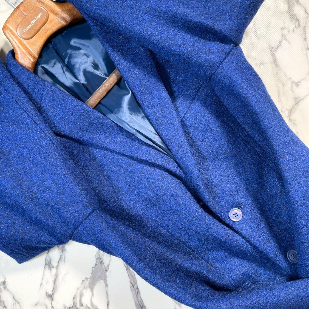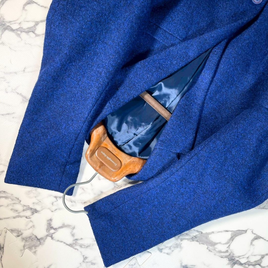 内側は総裏仕立てで、滑らかな裏地が袖通しを良くし、秋冬シーズンでも快適な着心地を提供。裏地やステッチワークの仕上げからも、丁寧な縫製とヨーロピアンテーラードの感性が感じられます。カラーは落ち着きのあるブルー(青)。深みと清潔感を併せ持ち、ビジネスからオフシーンまで幅広く活躍します。