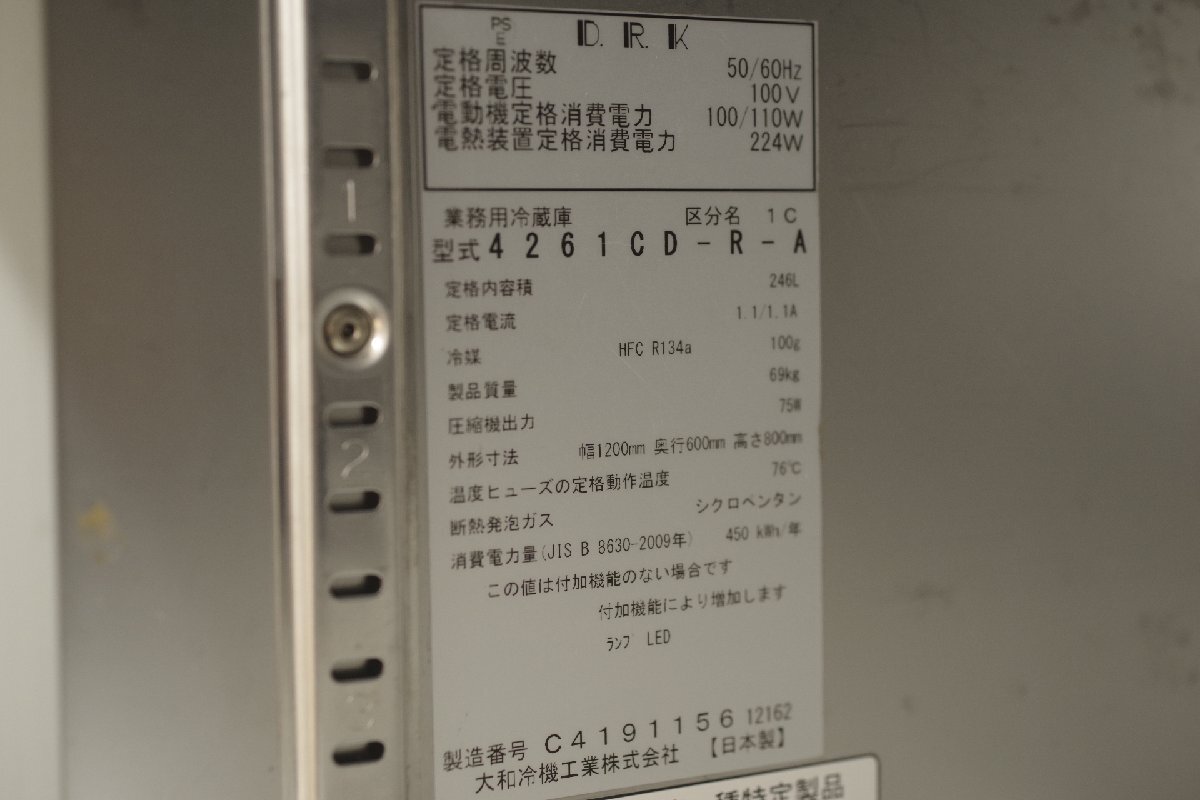 | 【商品紹介】 大和冷機より台下冷蔵庫 4261CD-R-Aのご紹介です。 ●仕様 ・型番:4261CD-R-A ・年式:2022年製 ・電源:単相100V ・庫内温度:-5℃~10℃ ・有効内容積:246L ・重量:69kg 付属品は掲載写真に写っているものが全てです。 台車は付属しません。 動作確認済です。 設定温度まで冷え、安定して保冷しておりました。 クリーニング済です。 背面のサビや天板のくすみはございますが、凹み等はなくまだまだ気持ちよくご愛用いただける程度の良い状態かと思います。 ご検討宜しくお願い致します。 この他にも商品を多数出品しておりますので、こちらから御覧下さい。 | ||