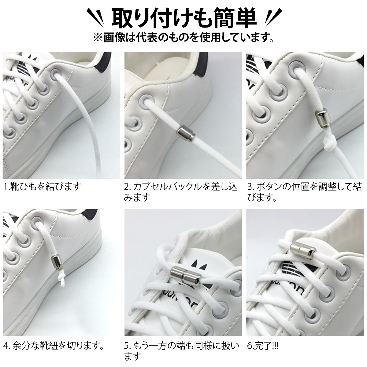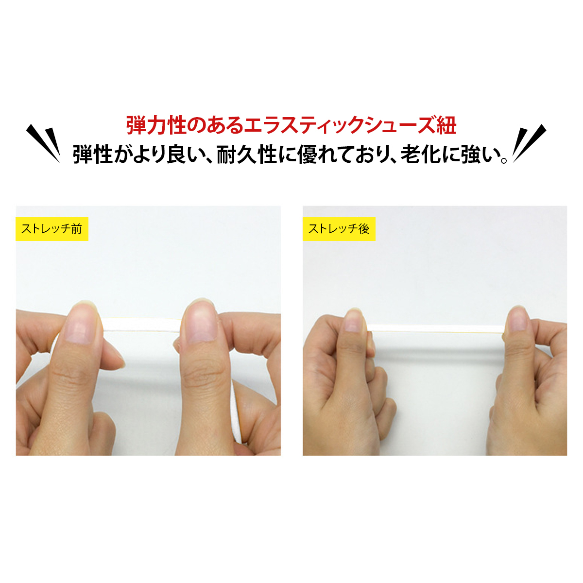 | ご注意 | 1. 通常の伸縮性のない靴紐や丸く太い靴紐には使用できません。 2. 手工測定にはわずかな誤差がありますので、ご理解ください。 3. ディスプレイや照明の影響により、実際の色が画像と若干異なる場合があります。 |
