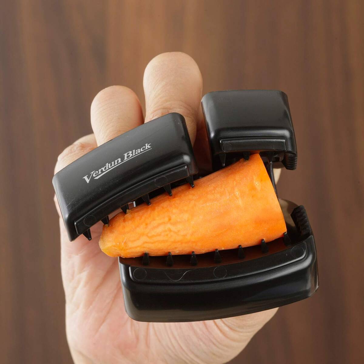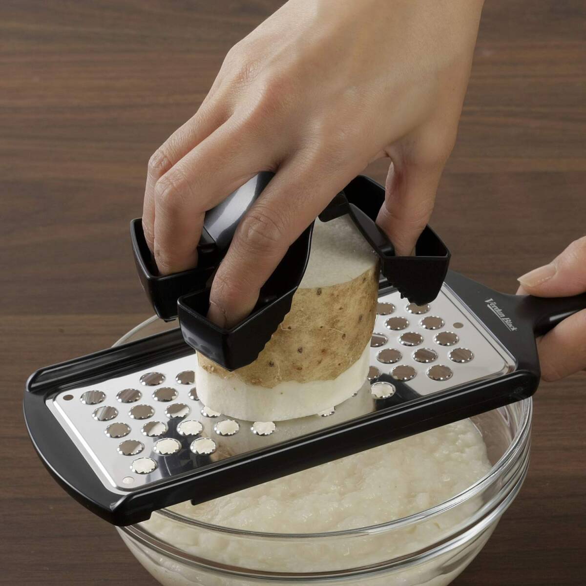 スライサーやおろし器をご使用時に。指先をガードしながら野菜を最後まで無駄なく調理できます。 野菜のスライスやすべりやすい山芋のおろし等に便利です。 指を入れるパーツが離れているので、いろいろなサイズ・形の野菜もしっかりつかめます。