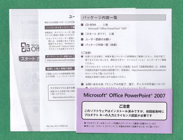 ●商品内容● ・Power Point 2007 (プレゼンテーションソフトウェア) Office PowerPoint 2007 には、Microsoft Office Fluent ユーザー インターフェイス と呼ばれる新しい直観的なユーザー インターフェイスが採用されており、以前のバージョンの PowerPoint よりもはるかに短時間で優れたプレゼンテーションを作成できます。 また、新しい効果や改善された効果、テーマ (テーマ: 色、フォント、図など、視覚的な表示効果に使用できるデザイン要素をまとめたものです。)、拡張された書式設定オプションなどを使用することで、ほんのわずかな時間で見栄えのよい動的なプレゼンテーションを作成できます。 ●対応OS● WindowsXP SP2以上、Windows Vista、Windows7、8、8.1、10 ●商品状態● 付属品すべてあります。 プロダクトキーありますので認証(オンラインまたは電話)を保証します。 電話認証やインストールに熟知していない方はサポートいたしますのでご安心下さい。 アップグレード版ではありませんのでこの出品物のみでインストールできます。 |
