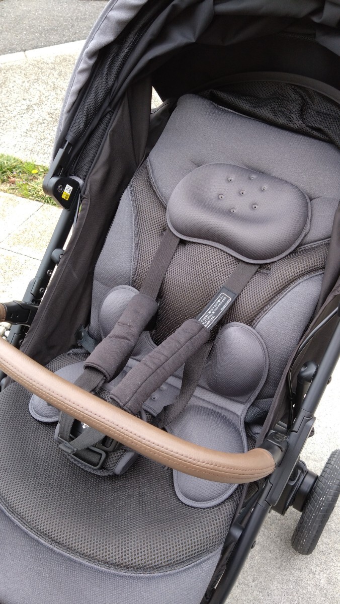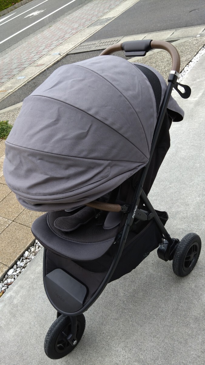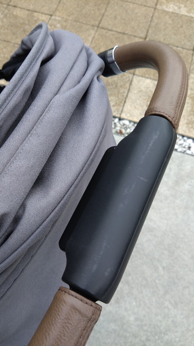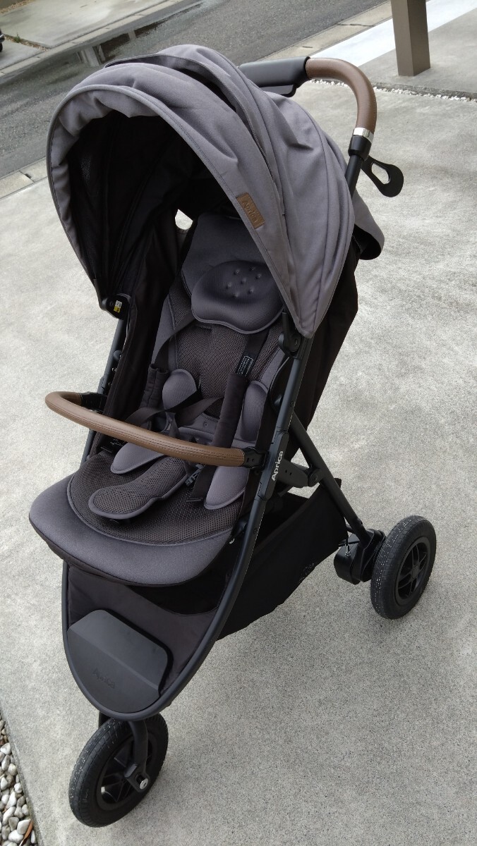ブラウンのハンドルが特徴のグレーのベビーカー。