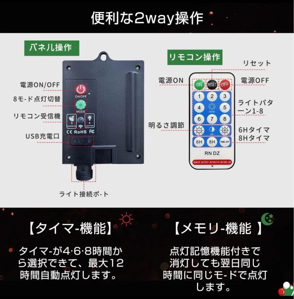 3mのランプ部分と4mのコードで簡単に設置可能。 1200mAhの大容量バッテリーに最新の省エネ技術を加えて、電力の持ちが一段と長くなります。ソーラー充電とUSB充電の2つのモードを搭載しております。 6~8時間のソーラー充電で10~12時間連続点灯可能、省電力、環境に優しい。 クリスマスの夜の屋外照明に最適です。 付属のサンタクロースの人形は、ハシゴの上でお好みな位置に取り付けることができます。 操作方法は、ソーラーパネルで直接操作するか、付属のリモコンで操作するの二種類です。利便性アップします!