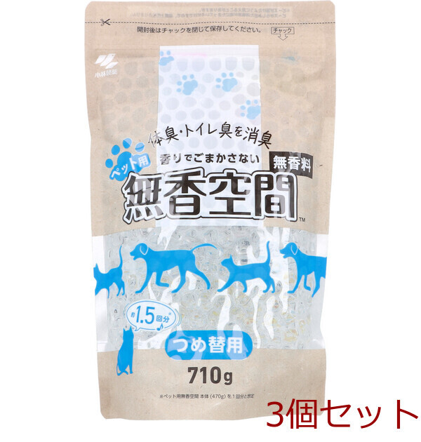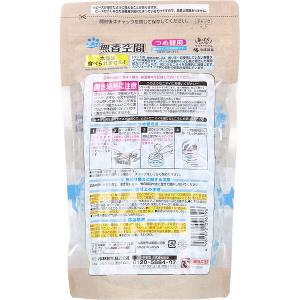 体臭・トイレ臭を消臭。 香りでごまかさない。 ・香りを一切使用していない無香タイプの消臭剤です。 ・ペットの体臭やトイレ臭に特化した専用処方にすることで、気になるニオイを効果的に消臭します。 ・スクリュータイプで安心設計の容器を採用しています。 ・芳香剤ではありません。 無香タイプの消臭剤です。 【つめ替方法】 (1)白く小さくなったビーズは濡れたティッシュを使い取り除く。 (燃えるゴミとして捨てられます。) (2)袋の上部を持ち、点線に沿って切る。 ※袋を強く持つと中身が飛び出るので注意する。 (3)ゆっくりと注ぐ。 ※他の消臭剤と混ぜない。 ※ビーズが跳ねてこぼれないように注意する。 (4)キャップを時計回りに回してしっかり閉める。 ・効果は使用環境により異なります。 ・開封後の中身を保存する場合は、チャックをしっかり閉めてください。 ・ニオイの発生源のできるだけ近くで、よどんだニオイを感じる所にお使いください。 個装サイズ:158X255X80mm 個装重量:約750g 内容量:710g 製造国:日本 【発売元:小林製薬株式会社】 【品名】 消臭剤 【用途】 室内・ペット用 【成分】 アミノ酸系消臭剤、吸水性樹脂 【使用期間】 約2~4ヶ月間持続します。 (効果の持続は季節や使用環境により異なります。) 【置き場所に注意】 誤食防止のため、苦味成分を入れておりますが、小児や認知症の方が誤って食べることがあるので、手の届かないところに置くなど、本体容器・つめ替パウチの置き場所に特に注意する。 【お取り替えに関する注意】 変色の恐れがあるので、継ぎ足したり、他の製品や水と混ぜて使用しないでください。 中身が減って、ビーズが白く小さくなったら「ペット用 無香空間 つめ替用」をお使いください。 残ったビーズを捨てる際は、燃えるゴミとして捨てられます。 白く小さくなったビーズは濡れたティッシュを使い、取り除いてください。 【使用上の注意】 ・本品は食べられない。 ・認知症の方や小児などが謝って食べると、水分でビーズが膨らむことで、喉・食道や気管などがつまり、重症になることがあるので、ご家族の方は製品を手の届かないところに置くなど、特に注意する。 ・ペットが遊ぶと誤って食べる恐れがあるので、ご家族の方は十分に注意する。 ・こぼれた場合はすぐに拭き取る。 ・ビーズがこぼれる可能性があるため、変形したキャップは使用しない。 ・直射日光の当たるところ、高温の場所に置かない。 ・ビーズは水分を吸収すると膨らみ、排水口がつまることがあるので、絶対にビーズは流さない。 ・用途以外には使用しない。 ・ペット用無香空間以外の容器につめ替えない。 ※誤食に注意。 【応急処置】 ・誤って口に入れた場合は、口に残っているビーズを取り出す。 ビーズは水で膨らむ性質があるので、ビーズが膨らみにくい牛乳やイオン飲料(スポーツドリンク)などをすぐに飲ませるなど応急処置をする(人)。 異常がある場合は本品を持参し、獣医師(ペット)、医師(人)に相談する。 ・手についた場合はよく洗う。 注意事項 ※予告なく成分・パッケージが変更になることがございます。 予めご了承ください。 *予告なく成分・パッケージが変更になることがございます。予めご了承ください *ダンボールを使用して発送する場合には、入数以下の個数の場合、 中古ダンボールを使用する場合があり、ご注文の商品とは異なるダンボールになる場合があります。 あらかじめ、ご了承ください。 |