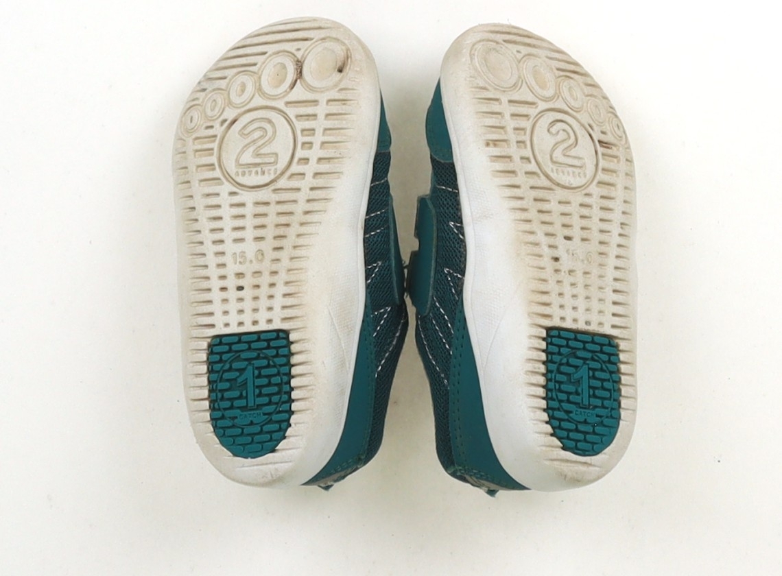 実際のサイズ表記は15cm。マジックテープ留め。全体に薄い土汚れ、テープ部分に毛羽付着、いくつか糸の飛び出しが見受けられます。