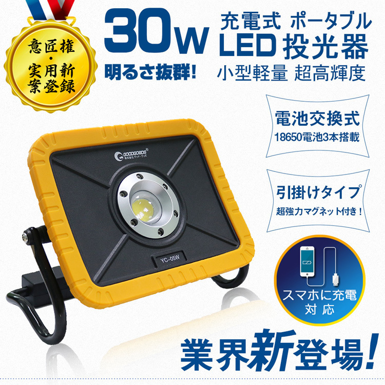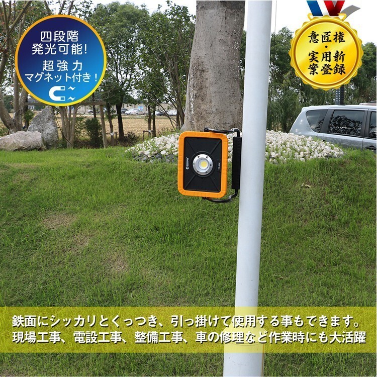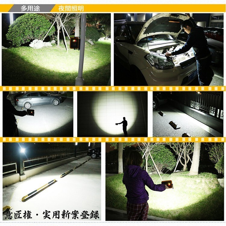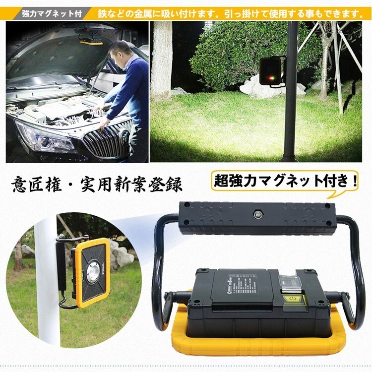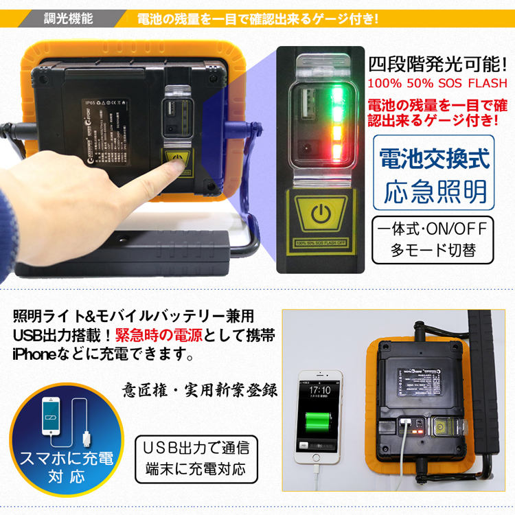| ★オススメポイント★ ★意匠権・実用新案登録 ★ 電池交換対応式・マグネット付きの30w 充電式LED作業灯登場!多機能・コンパクト・経済的 ★機能:4モード点灯、電池交換可能、マグネット付き、スマホに充電対応、U字型 床置き搭載、IP65防水・防塵、耐衝撃、バッテリー残量表示灯付き ★キャンプ・アウトドア、災害時の非常ライト、製造ライン 自動車整備、工事現場、倉庫作業、トラック荷台作業、各種現場作業などに 利便性アップ!交換できるバッテリー!! 従来の作業灯は、電池が内蔵されており、交換する事が出来ませんでした。 本製品は電池ボックスの蓋を開けるだけで、電池交換が簡単! 強力マグネット付で、鉄面へしっかり吸着! 作業時も両手が解放され快適に作業ができます。 ワンタッチで点灯4モード切替可能! ハイ・ローモード:使う場所や時間帯によって用途に合った使い方ができる。 SOS・フラッシュモード:イザというときに役に立つ! 稼働時間:ハイ 3時間、ロー6時間 バッテリー残量計付でバッテリー切れを事前にお知らせ バッテリー残量ランプ付き、電池残量がわかりますので、不意に消灯することを防ぎます。 地震、大型台風、ゲリラ豪雨、竜巻、など最近の自然災害の緊急時の照明としてご利用頂けます。 縦方向360°回転可能 上下の首振りは360°無断階で調整可能です。 IP65防塵防水規格 IP65相当の防塵・防水性能を保証。突然の雨やほこりの多い環境などでも、支障をきたすことなく利用可能です。 コードレスなので様々なシチュエーションで大活躍 夜間照明作業用: 室内での作業灯、電源の無い作業場、倉庫作業、自動車整備、ガレージ、物置などの照明等;車、バイクの整備の作業に適切します。 防災応急用: 車の緊急ランプ、停電時、地震や台風などの災害で万一電力供給がストップしても照明機能を保ち、防犯や避難などに貢献します |
