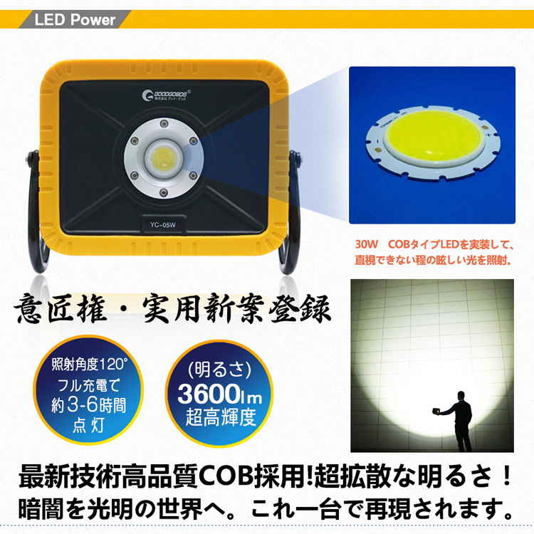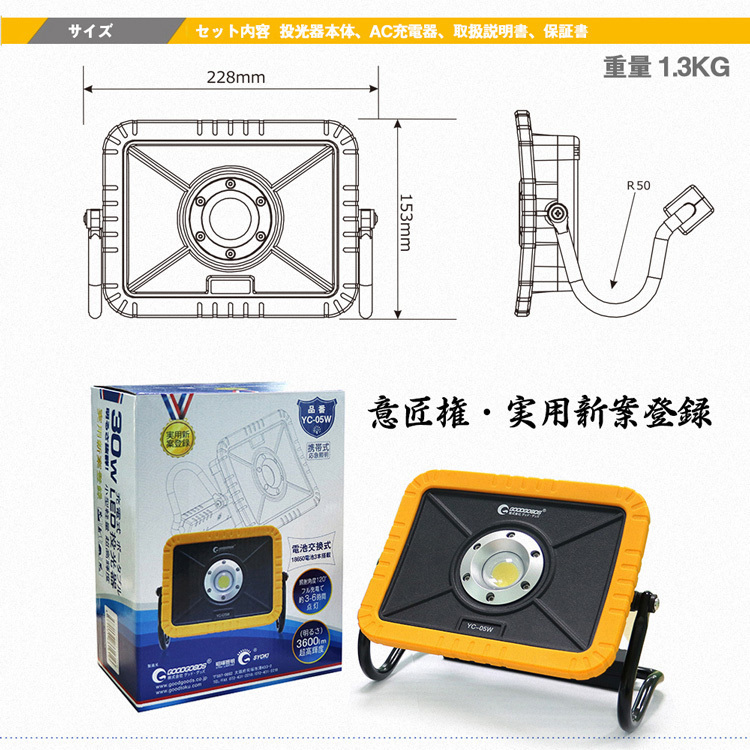 | 品番 | YC-05W | 商品名 | 充電池交換式投光器 意匠権・実用新案登録 |