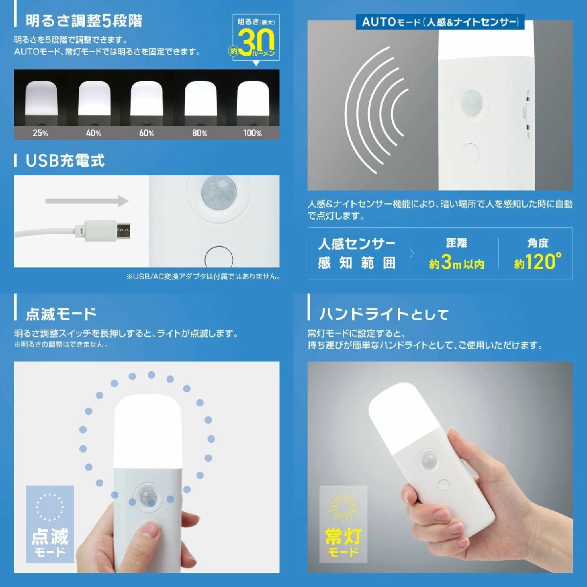 2WAY(置き型ライト /ハンドライト)使用が可能なUSB充電式ライトです。 人が通るのをセンサーが感知して自動で点灯するAUTOモードを搭載。 ◆置き型ライトとして ・人感&ナイトセンサーの機能で、必要な時だけ点灯する置き型ライトとしてご使用いただけます。◆ハンドライトとして ・常灯モードに設定すると、持ち運びが簡単なハンドライトとして、ご使用いただけます。◆明るさ調整5段階 ・明るさを5段階で調整できます。AUTOモード、常灯モードでは明るさを固定できます。 [セット内容] 本体、スタンド、USBコード ※USB/AC変換アダプタは付属いたしません。 |