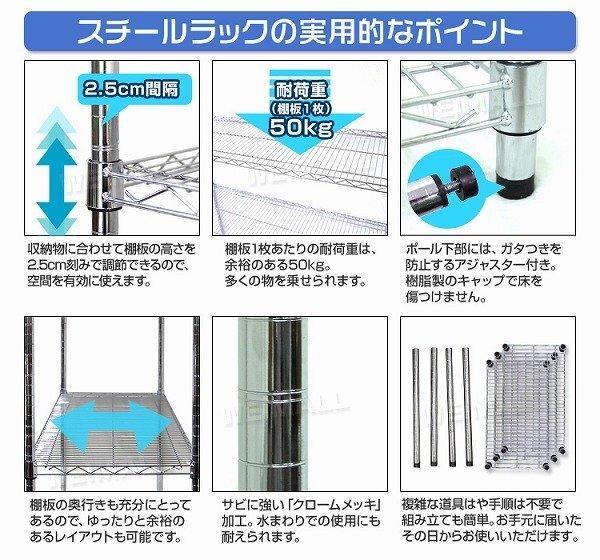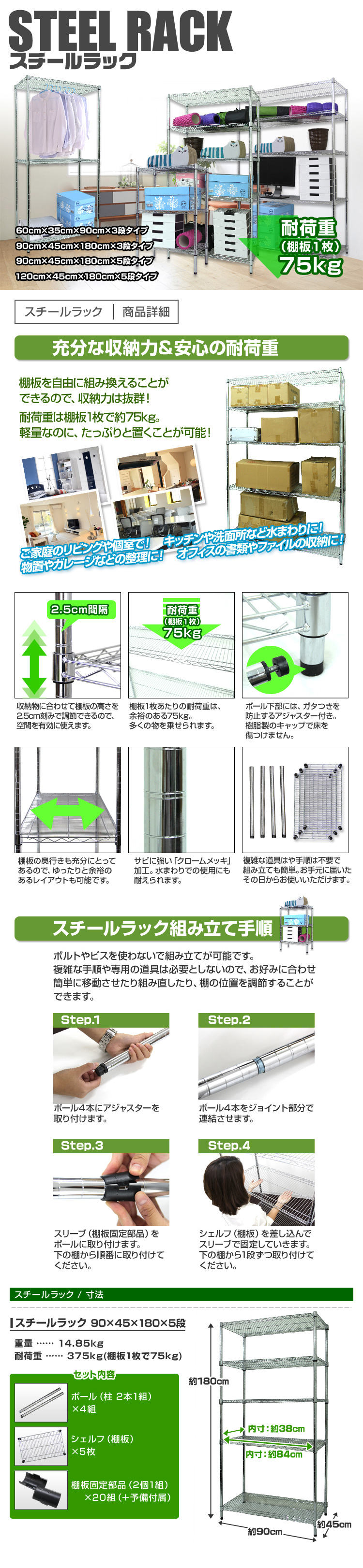 | どんなお部屋にも合わせやすいスチールラックです。 ぐらつき防止アジャスター付き! クギやネジを使わずに簡単に組み立て出来ます! 棚の高さを自由に変えることができます。 一人暮らしのお部屋やリビング、キッチン、物置など場所を問わず活躍できます。 アパレルショップの店頭用やオフィスにも使用されています。 ■商品仕様 サイズ(約):幅90×奥行45×高さ180cm 耐荷重(約):(全体)375kg / (棚板1枚あたり)75g 材質:スチール(クロームメッキ)、ABS樹脂他 重量(約):14.9kg カラー:シルバー ■商品内容 シェルフ(棚板) ×5 ポール(ジョイント式) ×4 棚板固定部品 ×20(+予備付属) 標準アジャスター(固定足) ×4 ■注意事項 ・海外製品で、簡易梱包での輸入のため風防に擦れや多少の小キズなどがある場合がございますが、商品自体には問題ありませんのでご了承下さい。 ・商品は、モニターによって色合いが異なって見える場合があります。 ・仕様・デザインは改良のため予告なく変更することがあります。 |