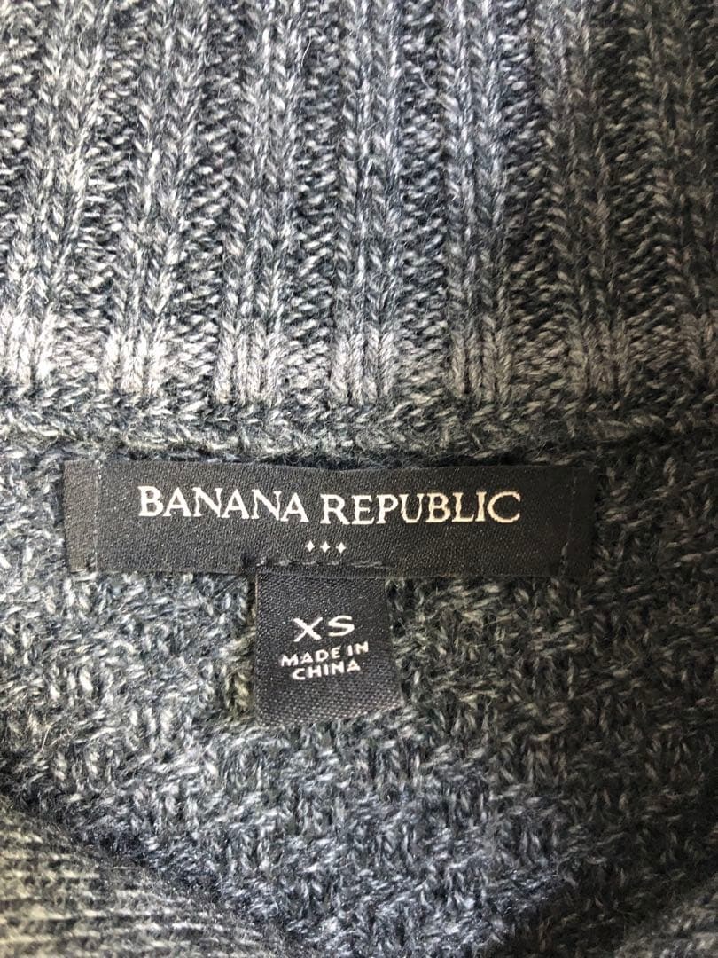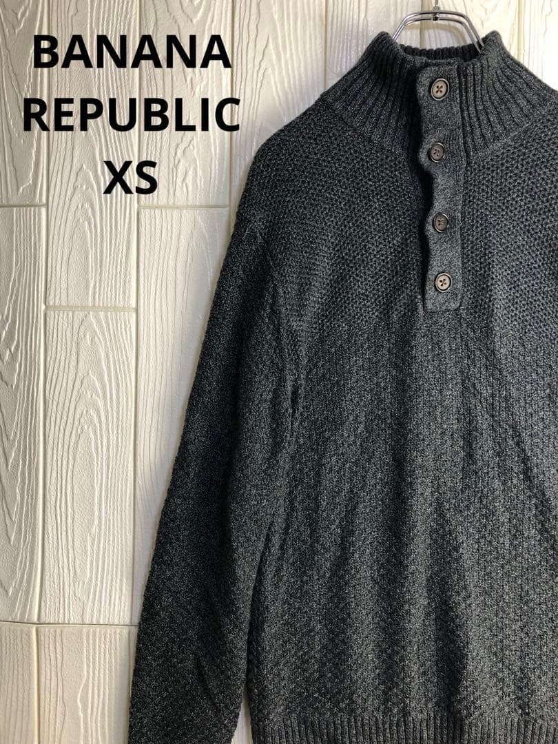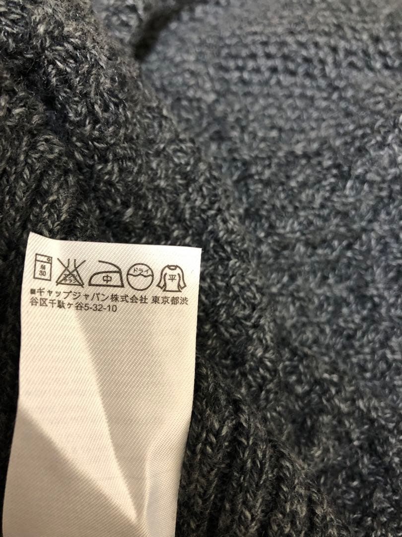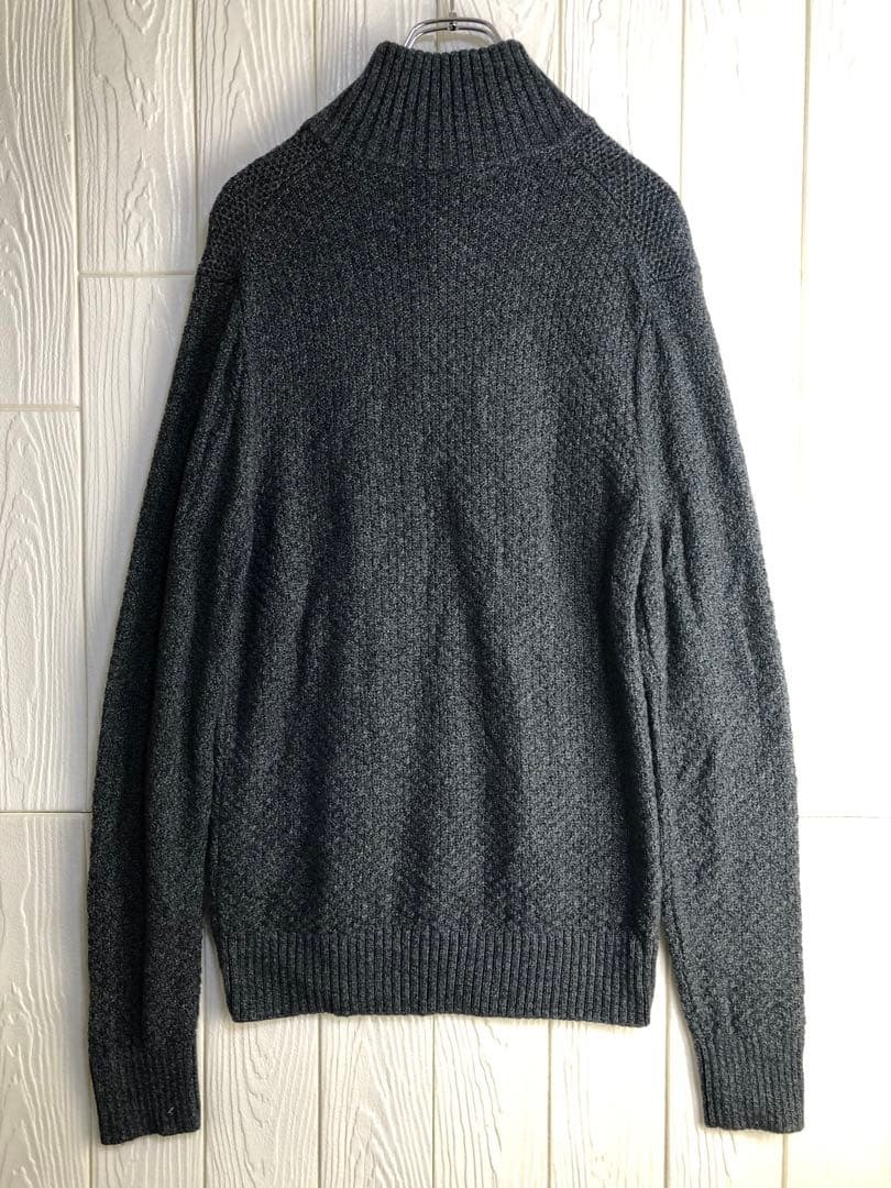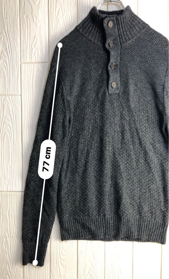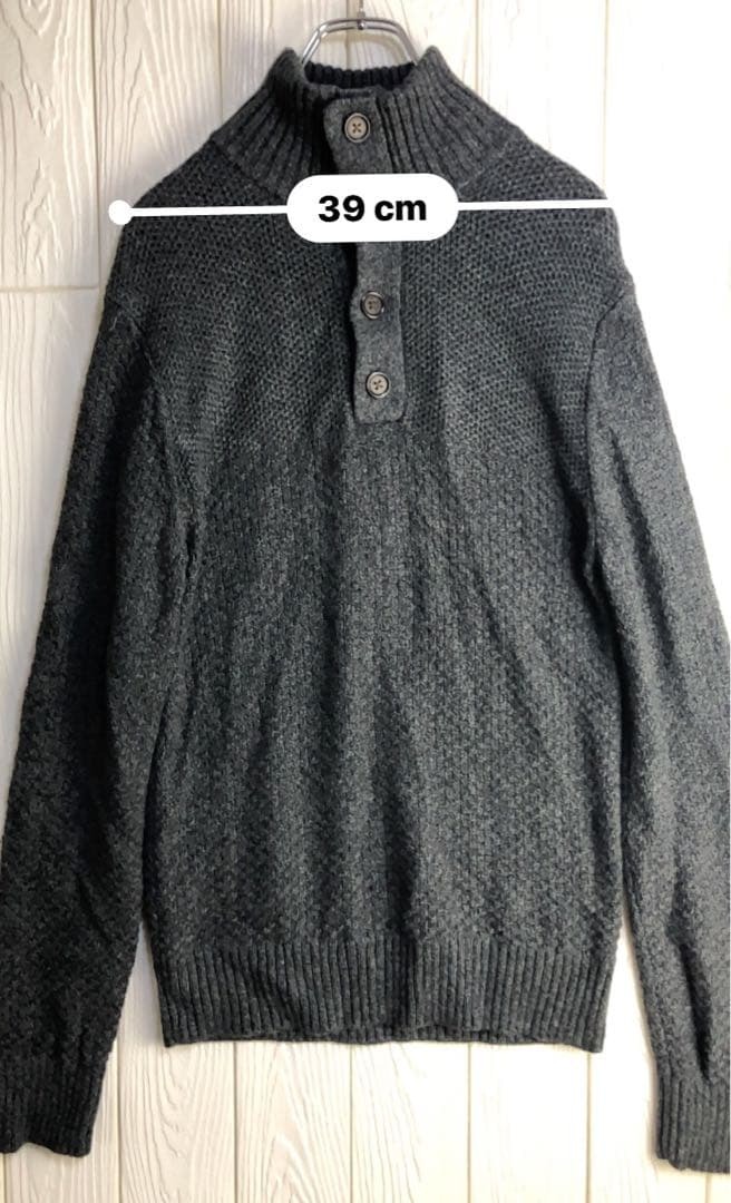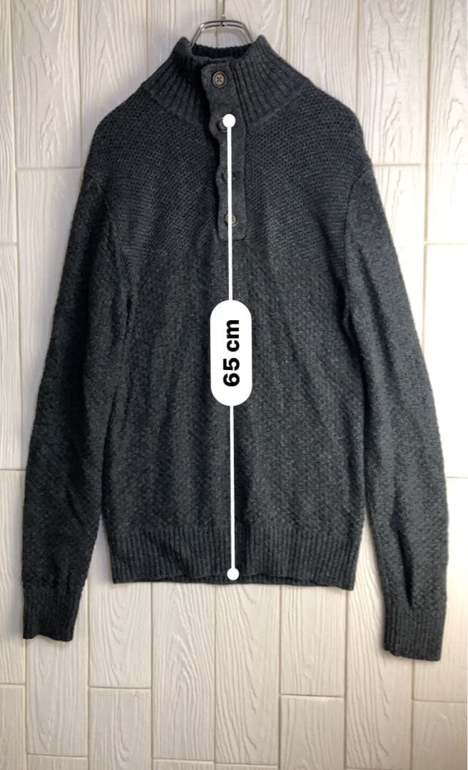ダークグレーのハイネックニットセーター、ボタン付きデザイン。